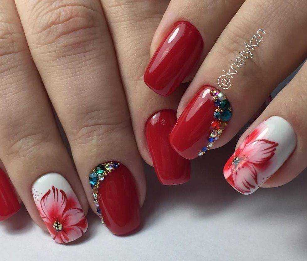Декор ногтей в красном цвете – бессмертная классика в ногтевом дизайне. Вариантов дизайнерских решений так же много, как и разнообразия палитры красного цвета. А красный маникюр с дополнением из стразов, кристаллов, блесков или камней смотрится еще роскошней и обворожительней. Такой маникюр превосходно дополнит праздничный образ.