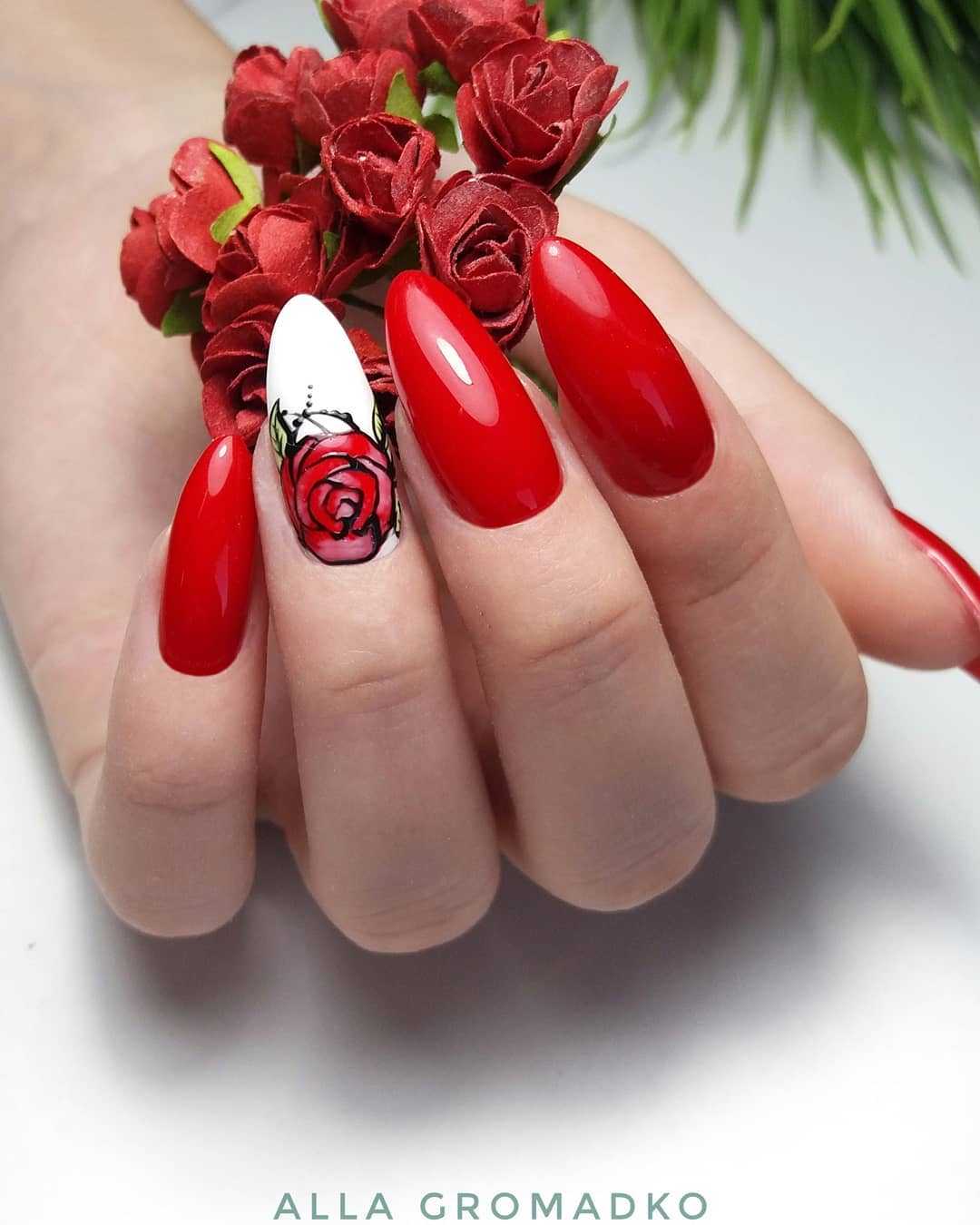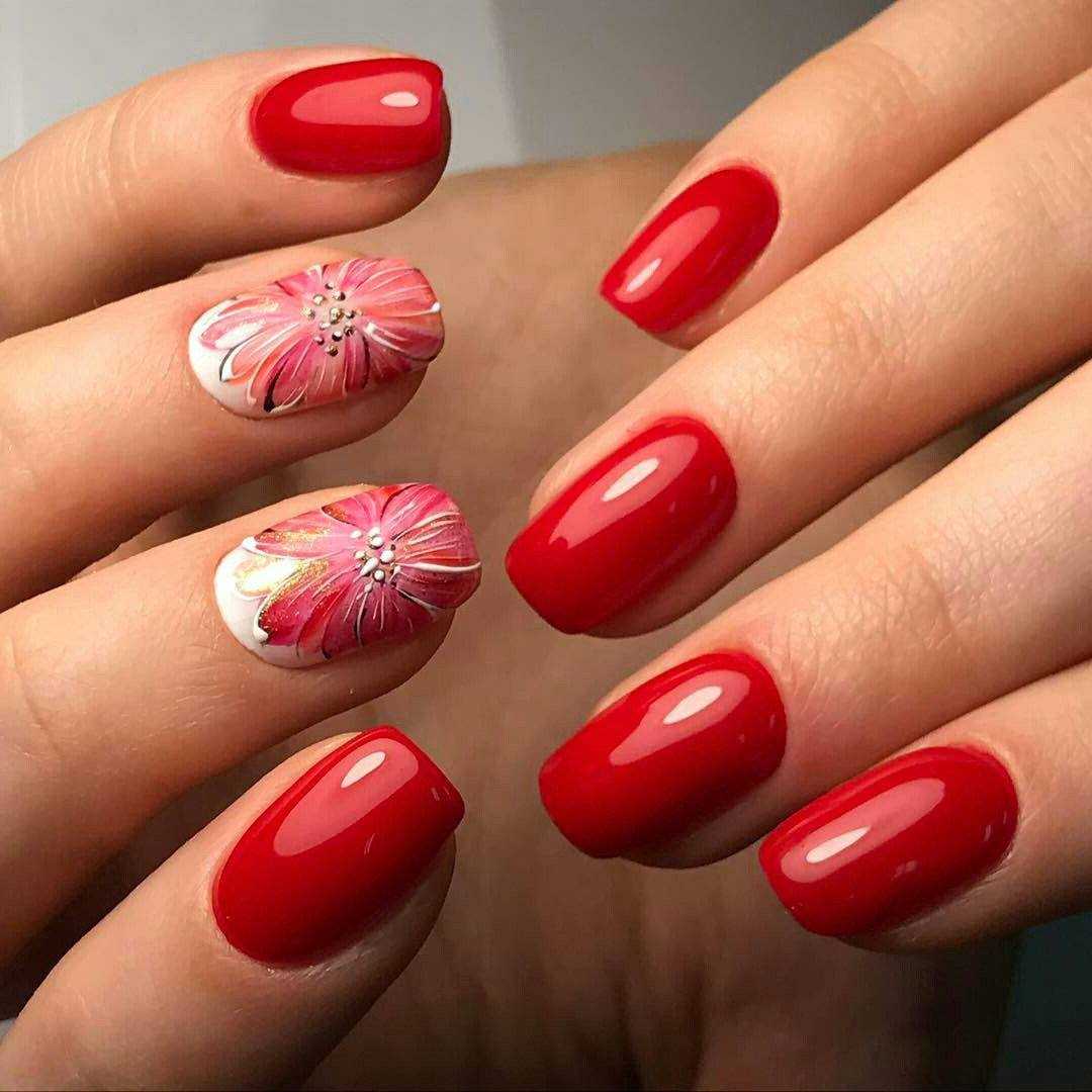 Красный маникюр, украшенный различными рисунками, придется по вкусу любой моднице. Выбор рисунка будет зависеть от выбранного вами образа. Это могут быть цветы, сердечки, бабочки или розы. Все рисунки прекрасно дополнят красный маникюр. Красный цвет в сочетании с желтым золотом или блестящим серебром создадут неповторимый и стильный маникюр.