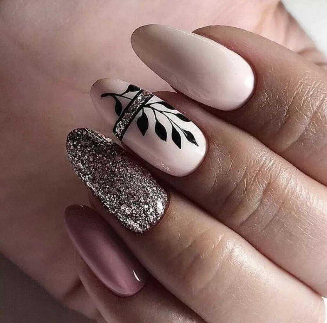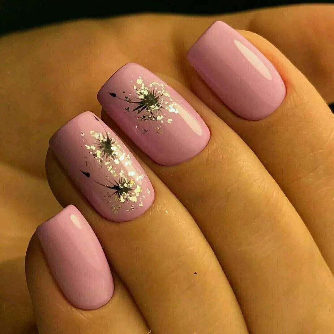 Чтобы создать такой маникюр, возьмите лак пастельного оттенка, базу, лепестки или листья, прозрачный лак с мелкими блестками или без них, пинцет и апельсиновую палочку или зубочистку.