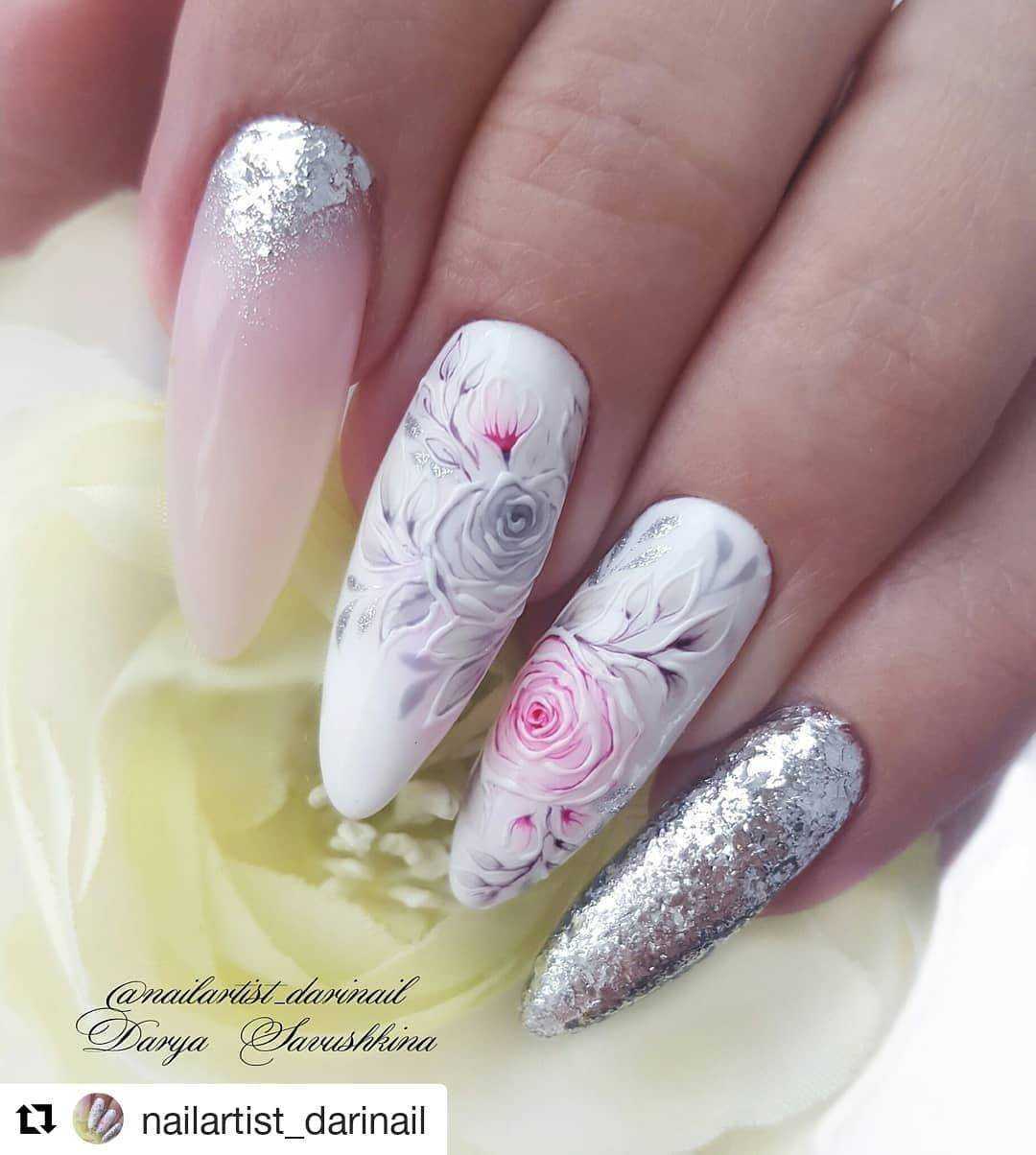 Интересно смотрятся нейл-арты с чайной розой. Этот цветок отличается невероятной нежностью и благородством. Цветок чаще всего выполняется в нежных пыльных оттенках. Красиво выглядят чайные розы, выполненные с помощью акриловой пудры или густой гель-пасты.