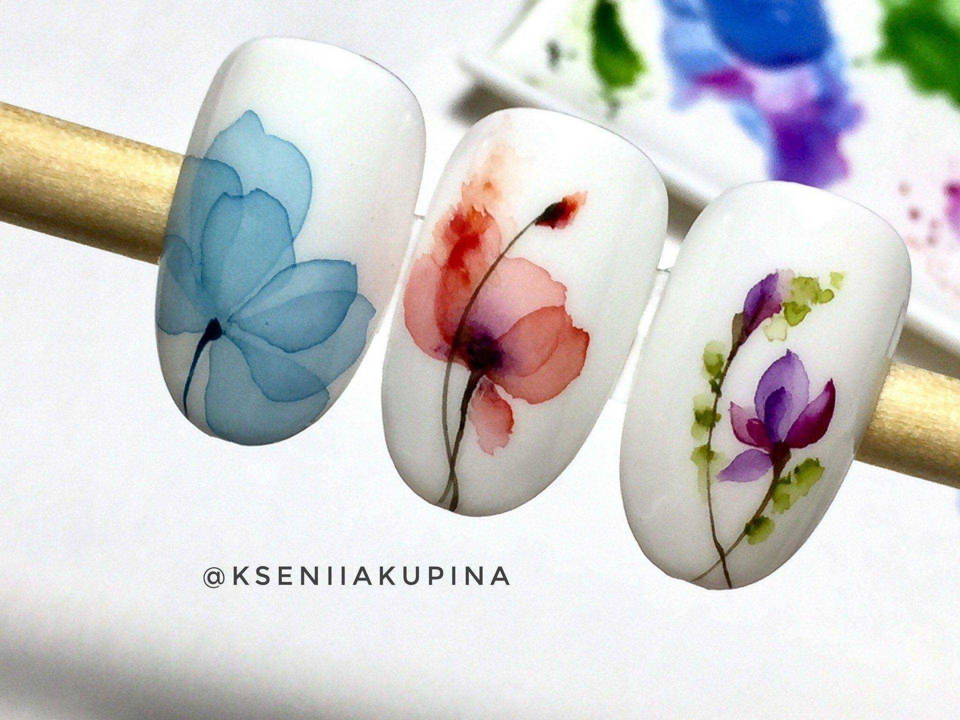 Крупные цветы, выполненные в китайской, «жидкой» или жостовской манере придают ногтям волшебный и изысканный вид, особенно если они сочетаются с длинными ногтями. Рисунки располагаются по всей длине ноготка, и нередко дополняются другими декоративными элементами. Самый крупный бутон в пастельных и светлых тонах обычно рисуют на среднем пальце.