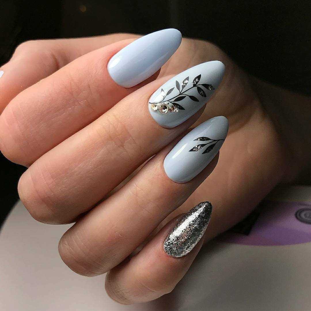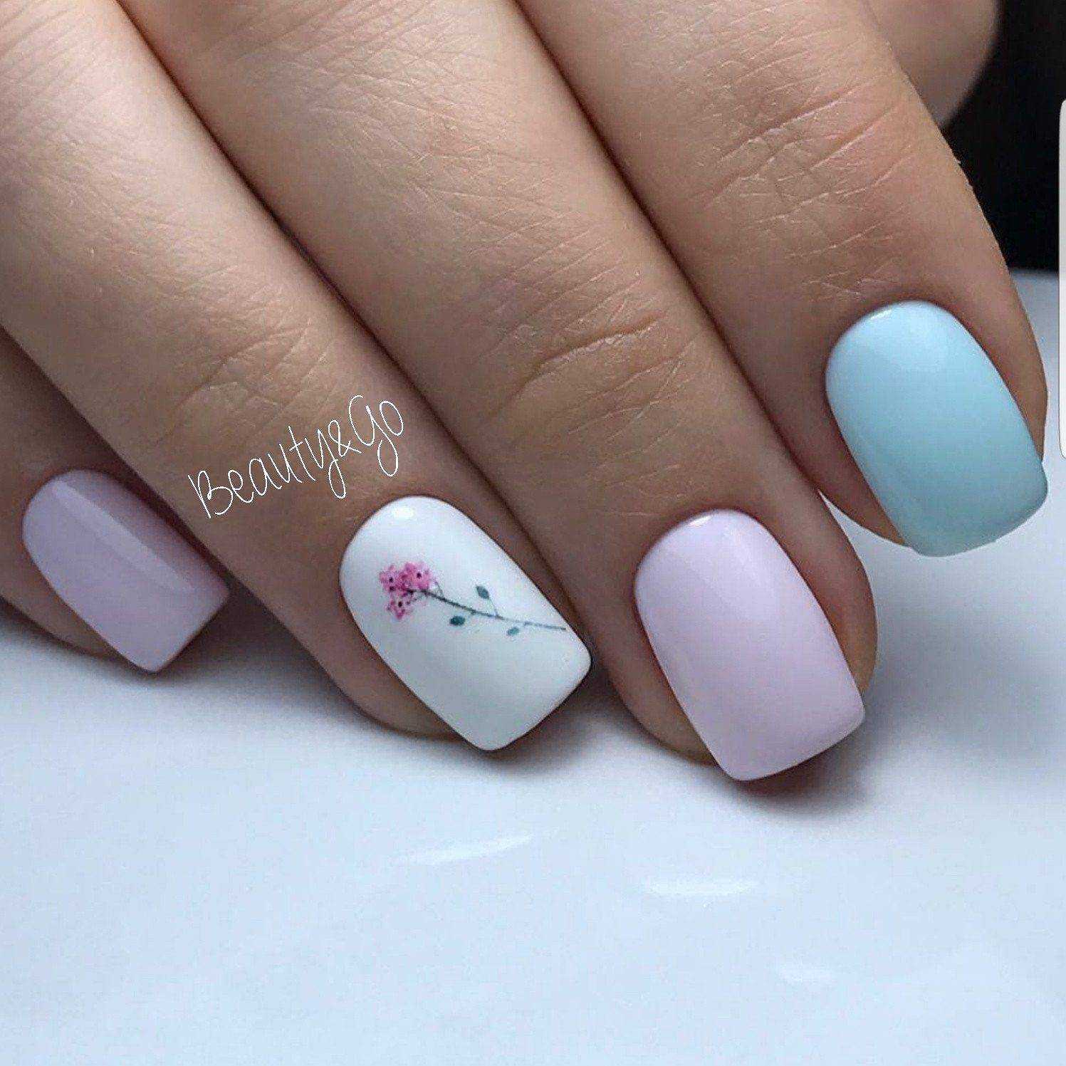 Минималистические направления в дизайне ноготков благодаря своей простоте и лаконичности пришлись по вкусу многим барышням и стали очень популярными в этом сезоне. Романтичным и утончённым натурам придётся по вкусу светлая палитра лаков, а также нежные голубой, розовый, лиловый и им подобные оттенки покрытий. Любительницам тёмного маникюра можно оформить пару пальчиков светлым дизайном, а остальные ноготки покрыть понравившимся глубоким оттенком. Небольшое дополнение в качестве миниатюрных цветочков, веточек, бутонов, листиков, украшенных по желанию одиночными элементами блестящего декора, и изящный цветочный дизайн готов.