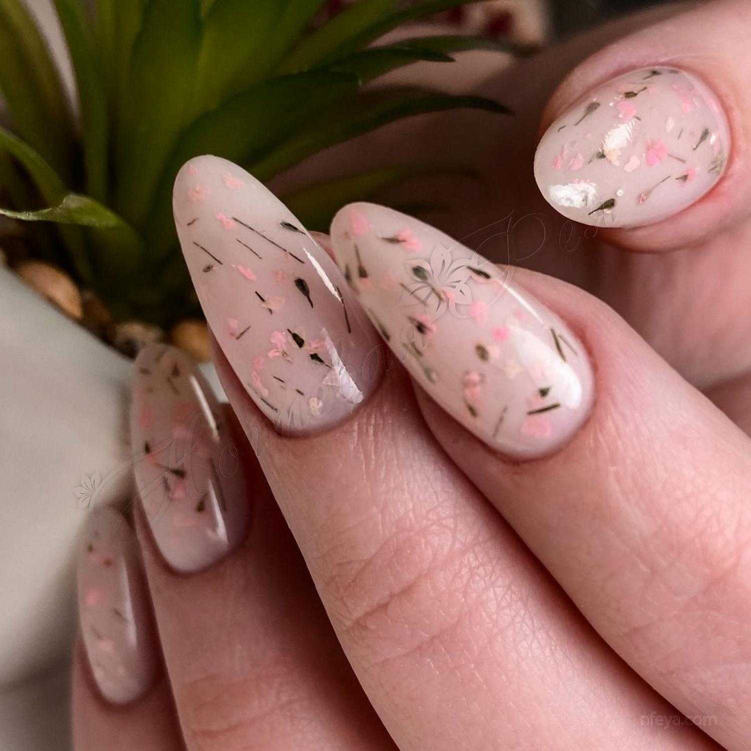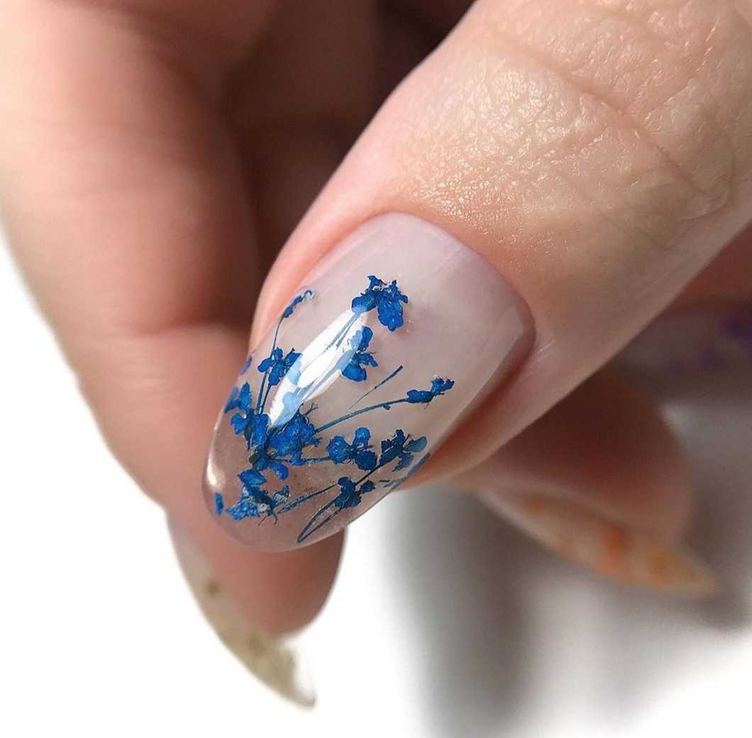Создать маникюр с сухоцветами проще на наращенных ногтях с помощью искусственных материалов. Но девушкам с натуральными пластинами не стоит расстраиваться. Есть способ, который поможет закрепить высушенные цветы даже на коротких ногтях.