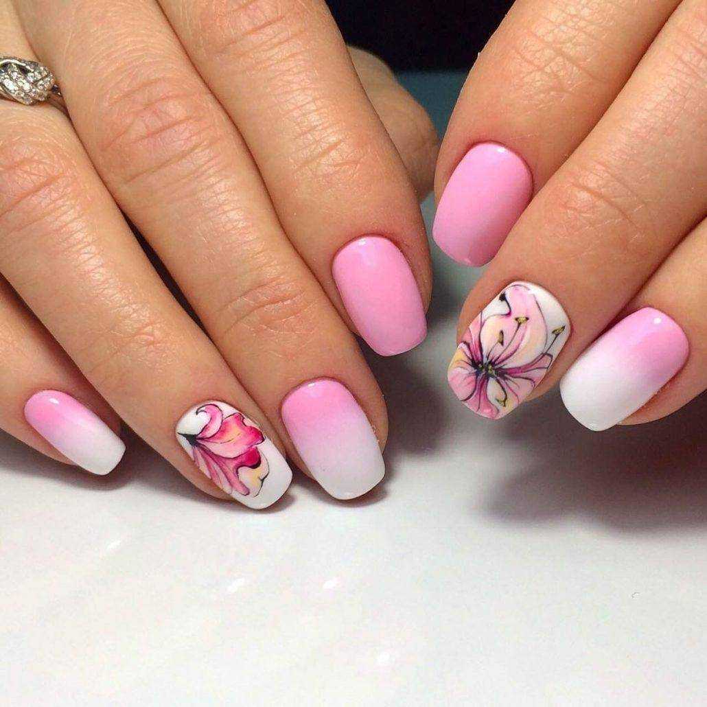 Нежный и женственный вариант омбре. Здесь можно использовать розовый и белый, розовый и другие оттенки палитры. Переход может быть почти невидимым или контрастным. В качестве декора подходит втирка, блестки или рисунки.
