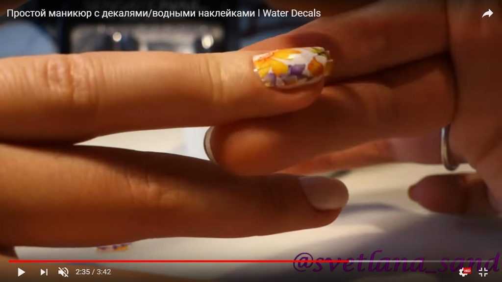 Маникюр с водными наклейками готов. Запечатайте финишным покрытием края пленки, тогда ваш маникюр будет более стойким.