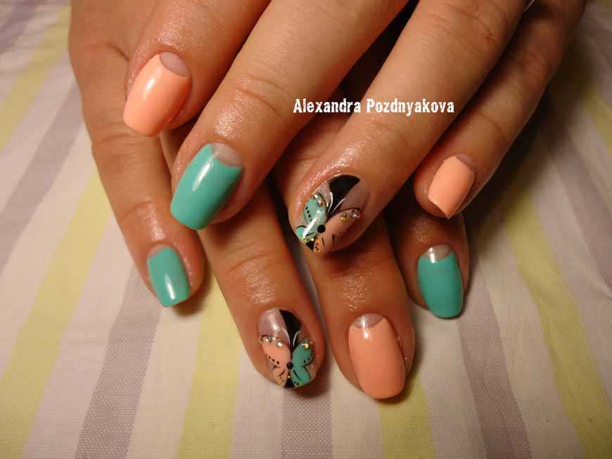 Можно нарисовать на ногтях узоры, которые будут имитировать цветное крыло бабочки. Такой маникюр будет смотреться очень оригинально. Этот дизайн лучше всего делать летом.