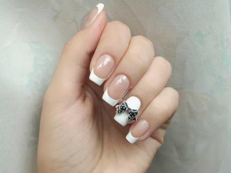 Сочетание французского маникюра с мотивом «бантик» сегодня стало настоящей классикой жанра нейл-арта. Сочетание белого, пастельно-розового и черного цветов делает этот дизайн женственным и элегантным. В этом случае дуги на ногтях располагаются строго по линии «улыбки».