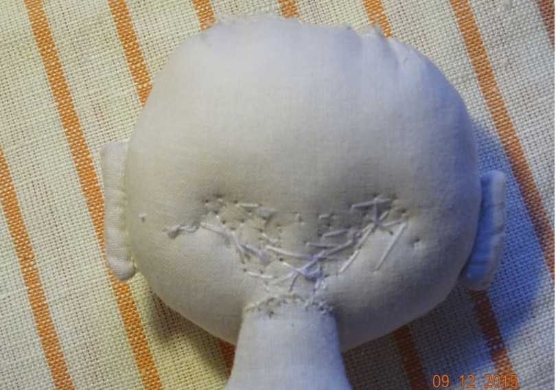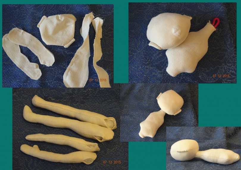 Куклу нужно мастерить по частям: сначала сделать все части тела (голову, кисти, ступни, попу), после чего пришить их к одежде.