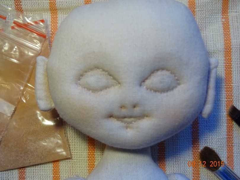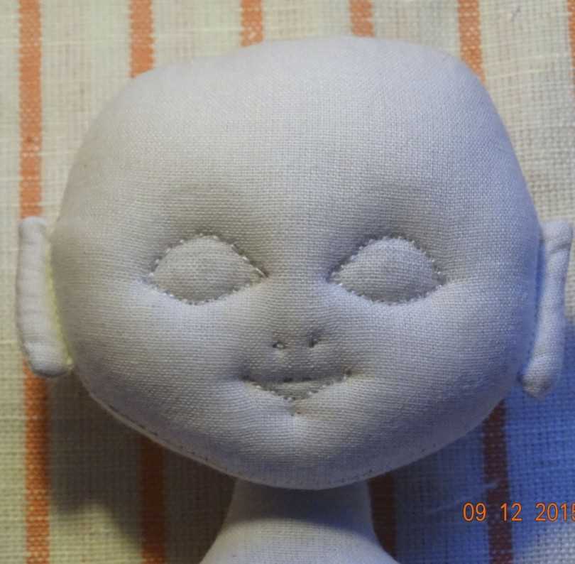 Иногда утяжка лица делается на предварительно сформированном рельефе. Некоторые мастер-классы предлагают на заготовку головы куклы накладывать отдельно щечки, нос, подбородок, лоб и даже губки, а затем это все накрывается тянущейся тканью, к примеру, из колготки и утягивается поверх материала.