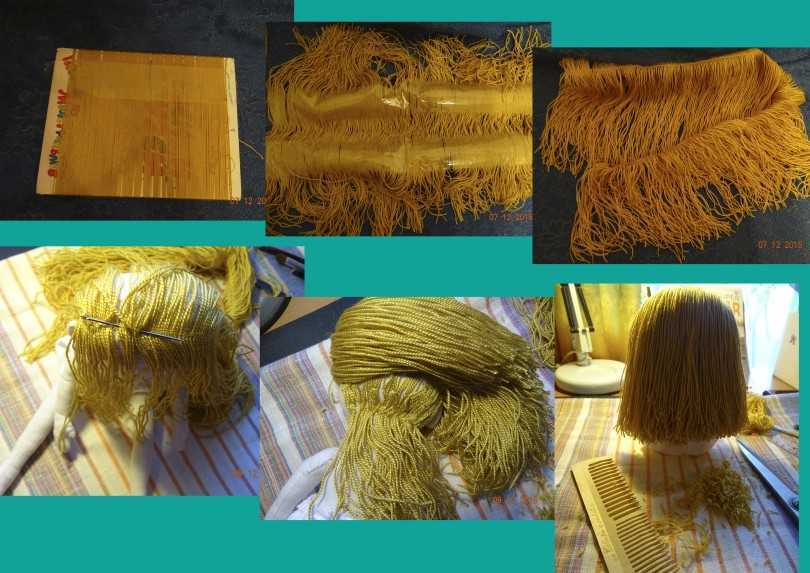 - Из вязальной пряжи или шнура плетут две косы и пришивают их к голове поделки.