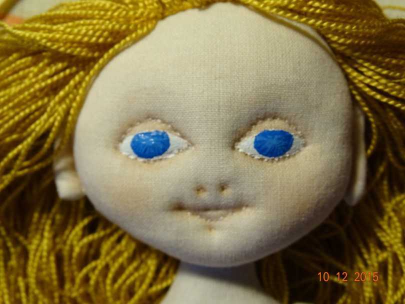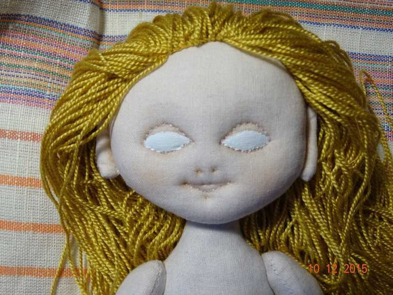 Готовые, наполненные синтепоном детали Барби сшиваем потайным стежком, на головке закрепляем подготовленные волосы-паричок с помощью клея или иголки с ниткой. Затем приступаем к оформлению лица. Его можно нарисовать или приклеить готовые глазки, носик, губки.