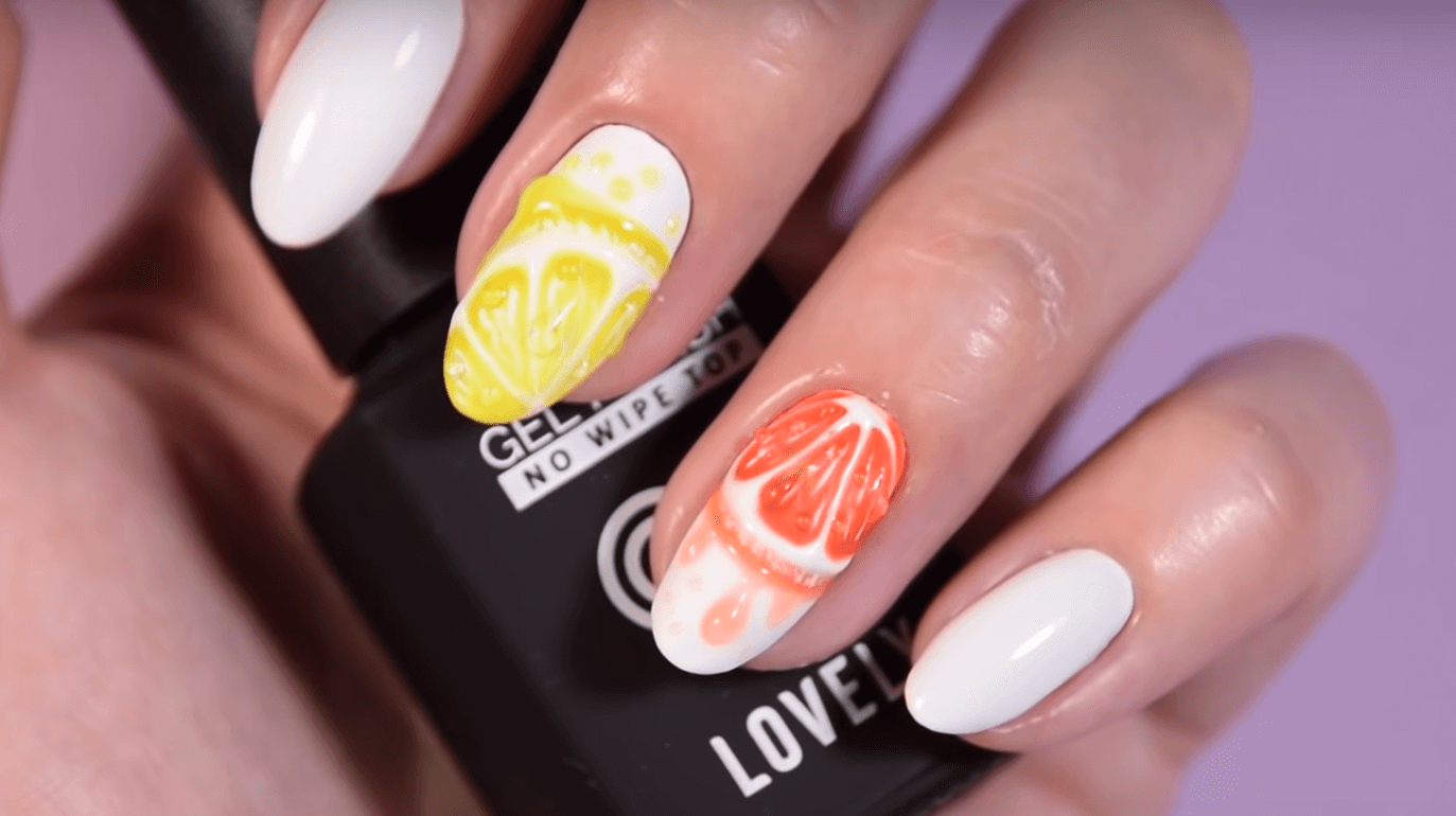 Создавая летний маникюр, можно включить фантазию и сделать, например, фруктовый принт. Прозрачные пузырьки будут создавать реалистичный образ.
