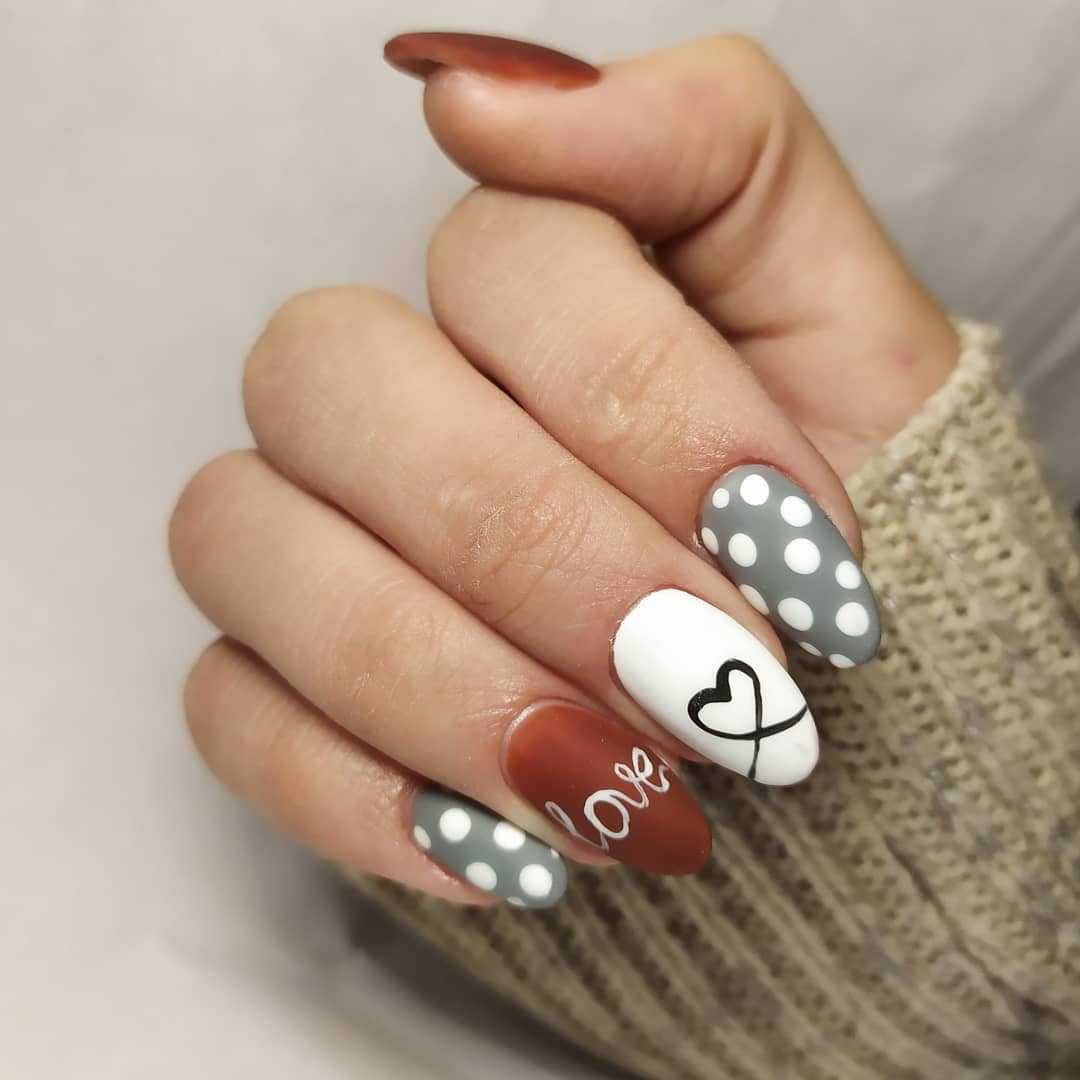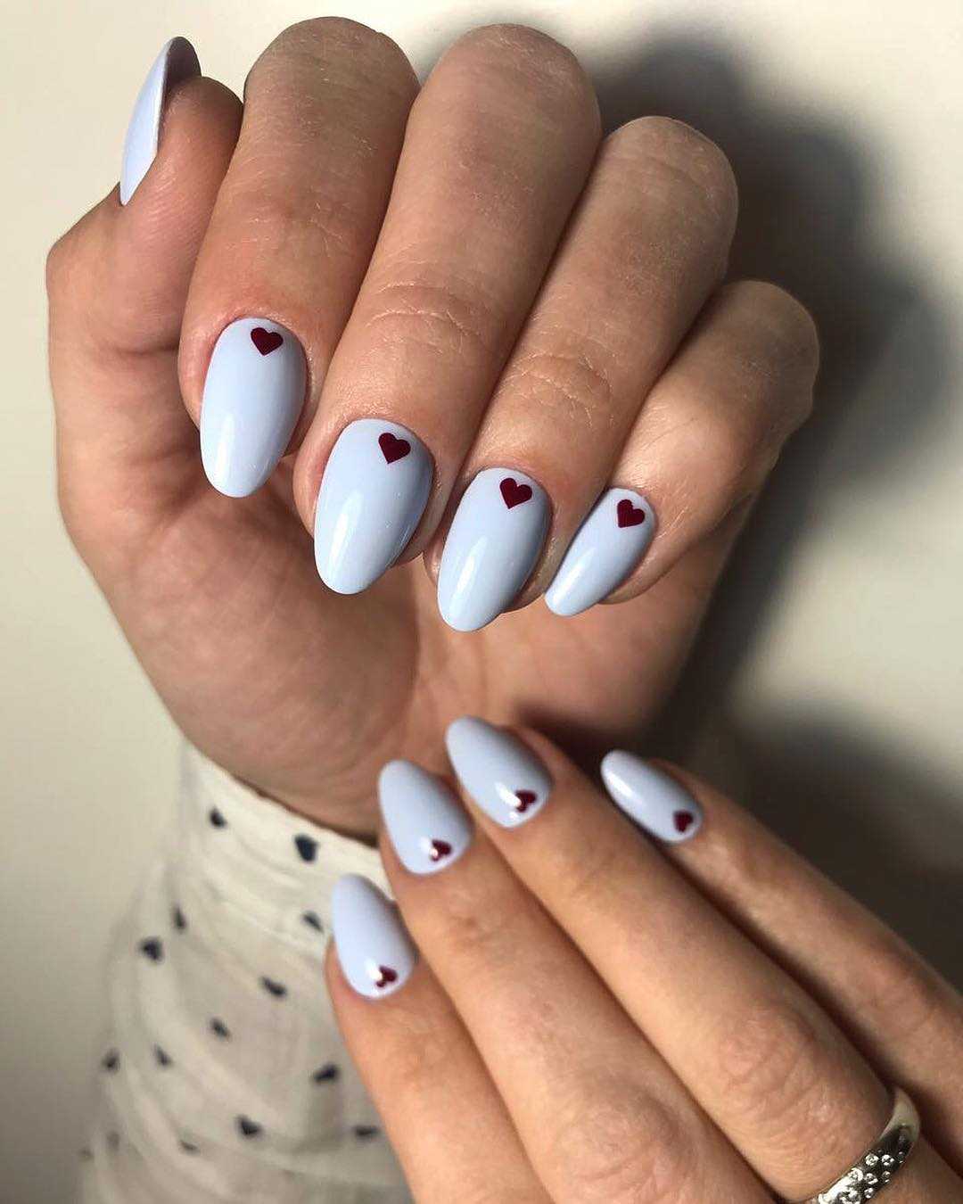 Этот вариант подойдет милым и скромным девушкам. Розовые или бежевые ногти в сочетании с маленькими сердечками смотрятся очень женственно. Такой дизайн будет выглядеть аккуратно и придаст нотку нежности вашему образу.