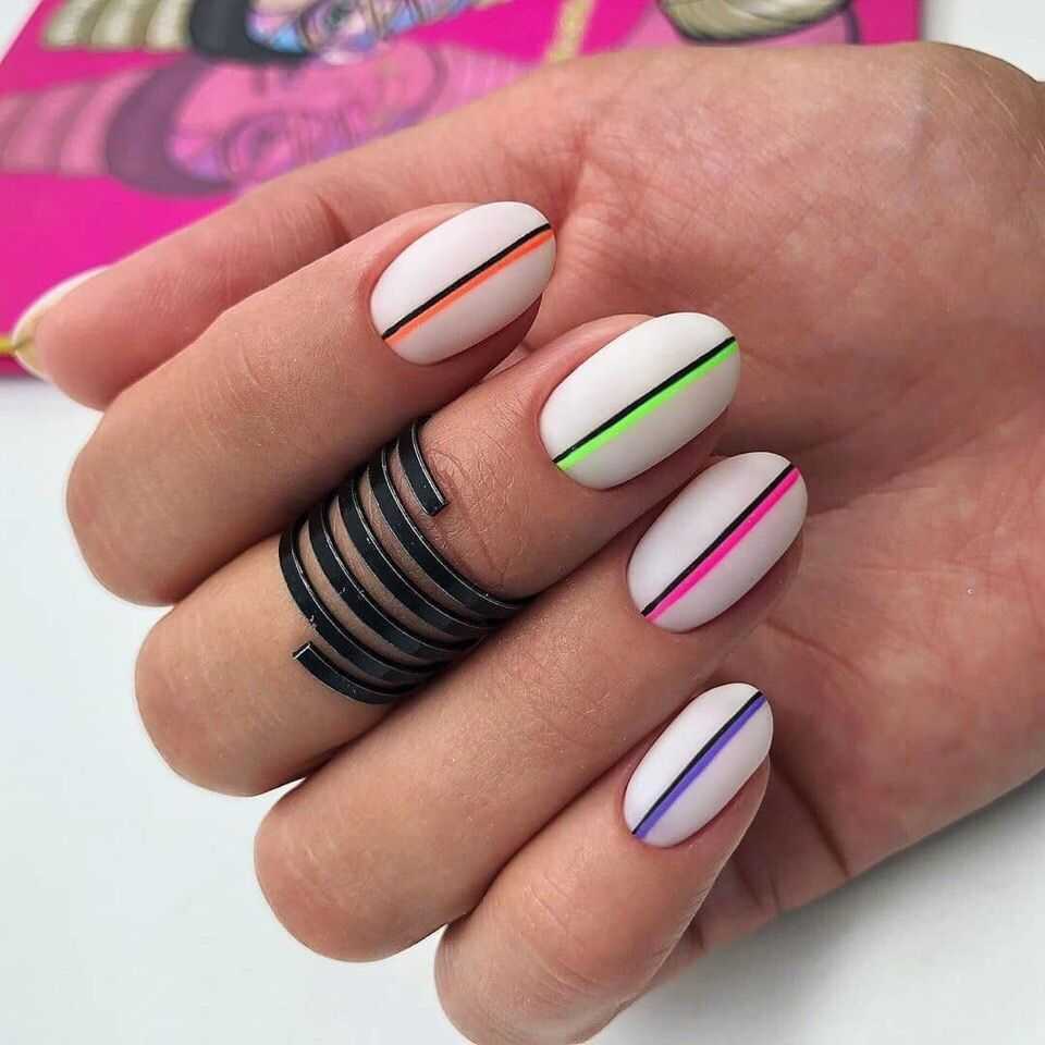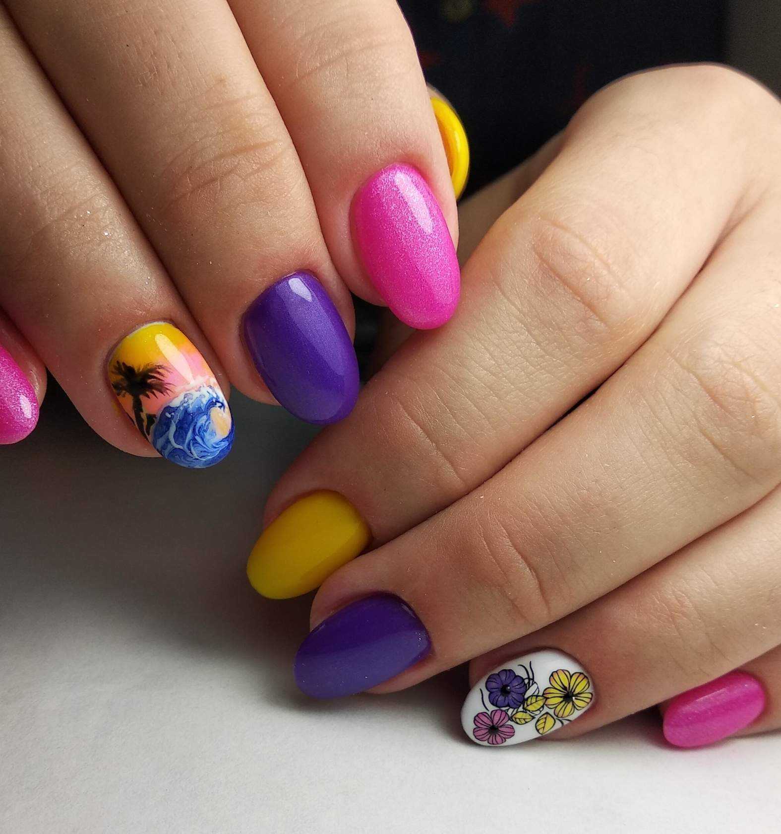 Зачем выбирать один цвет, если можно использовать несколько одновременно? Разноцветные ногти — отличная идея для тех, кто хочет сделать смелый и неповторимый маникюр. Не стесняйтесь проявлять творческий подход и воплощать в реальность этот смелый и модный дизайн. Оттенков на выбор так много, что можно растеряться! Более того, вы можете сочетать выбранные цвета с креативным декором. Это будет выглядеть очень молодёжно и стильно.