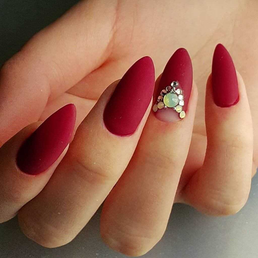 Матовый – это современный взгляд на красный маникюр. Выигрышно смотрится, и в темных, и в ярких оттенках, на базе которых можно сделать френч, лунный маникюр.