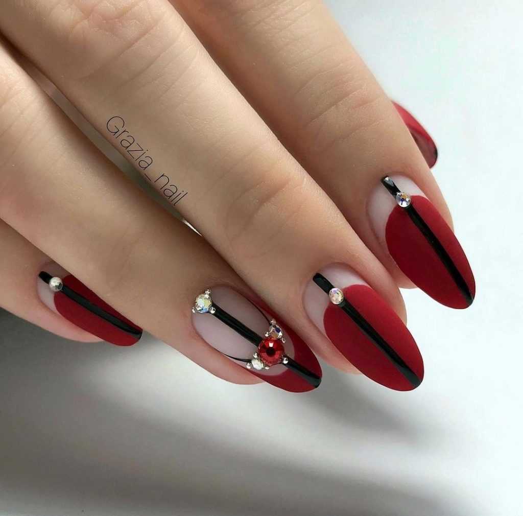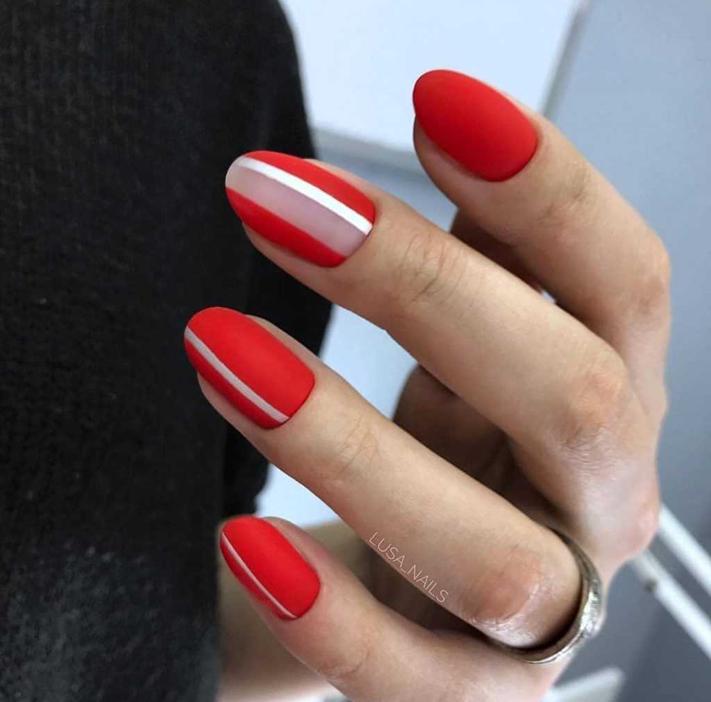 Красный маникюр любит элементы геометрии в тандеме с матовым покрытием.