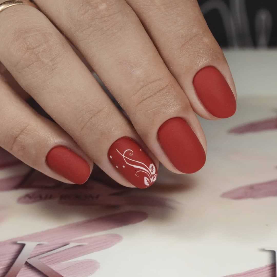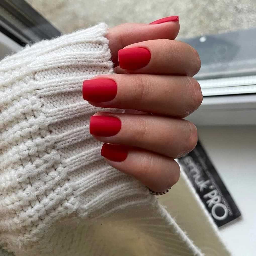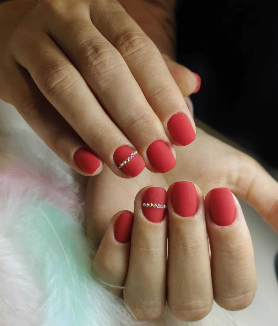Красные покрытия не менее красиво, но не так вызывающе выглядят на коротких ноготках. Маникюр на короткие ногти, особенно если использовать матовый топ, получается очень стильным. Ниже на фото маникюр с матовым эффектом. Как вам такое решение?