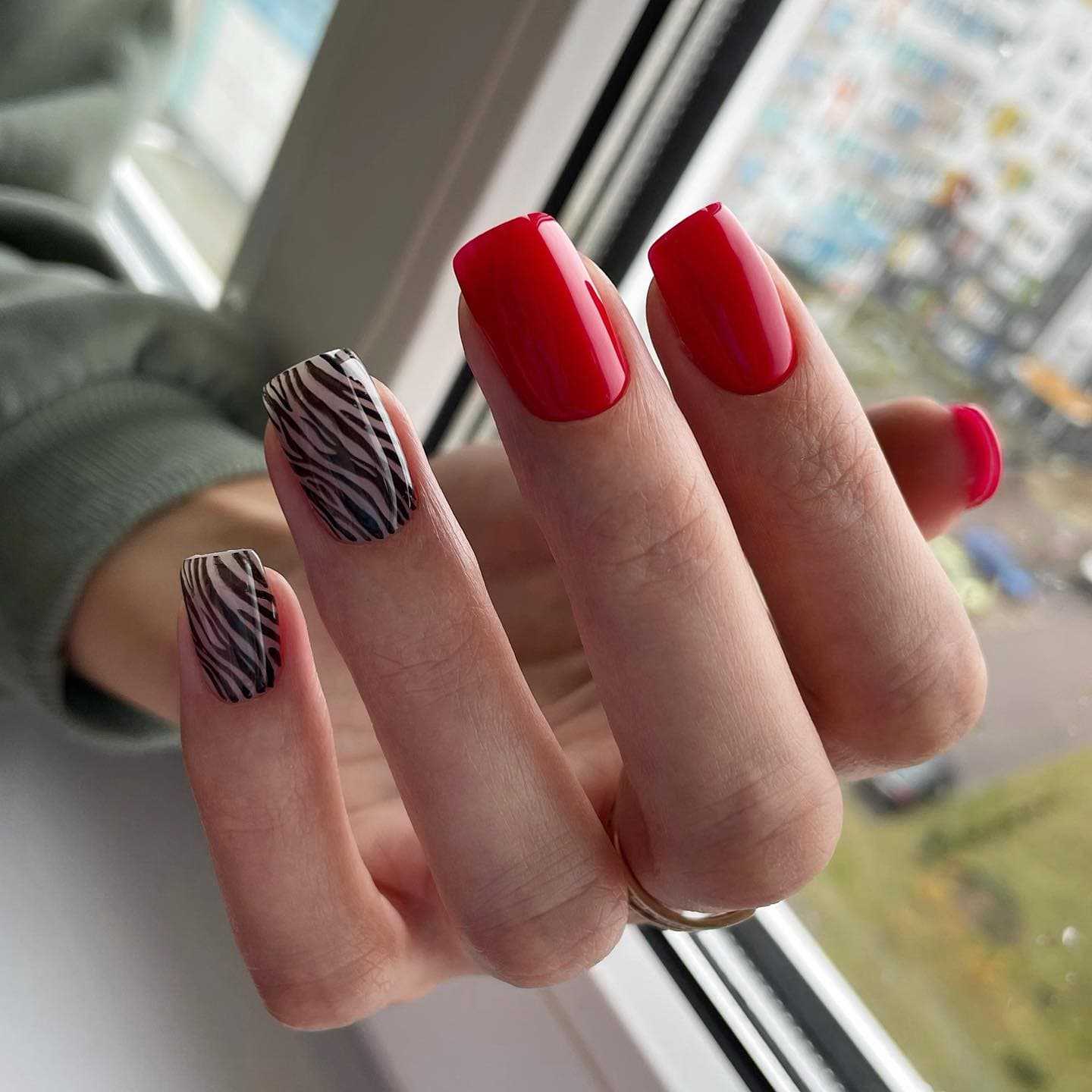 Дизайн с ярким лаком легко разнообразить стильными минималистичными рисунками. Это может быть геометрия или фантазийные узоры, анималистичные принты или растительные мотивы. Поэтому красный миндаль не выходит из моды и стал постоянным трендом каждого сезона.