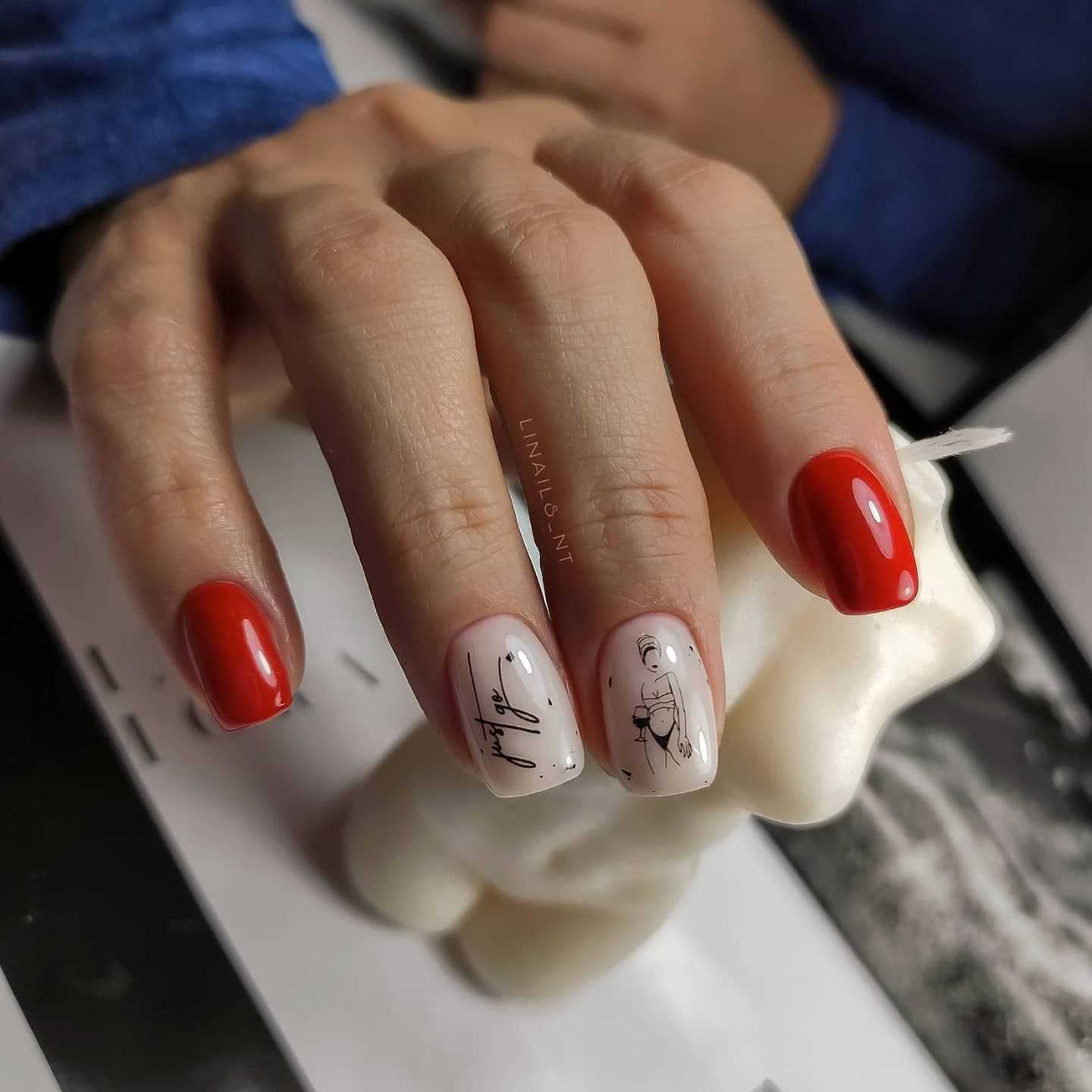 - Чаще всего наносится черная надпись на белом фоне. Нежнее смотрится красный и несколько ноготков с молочной или нюдовой основой, а на них черные или красные надписи.