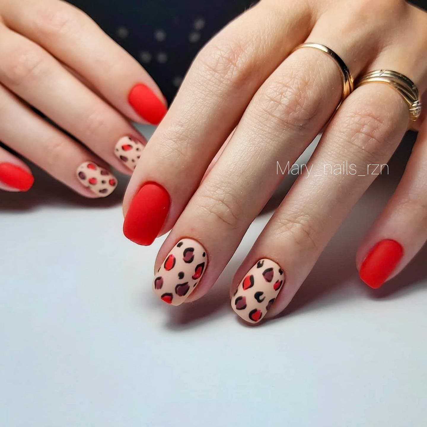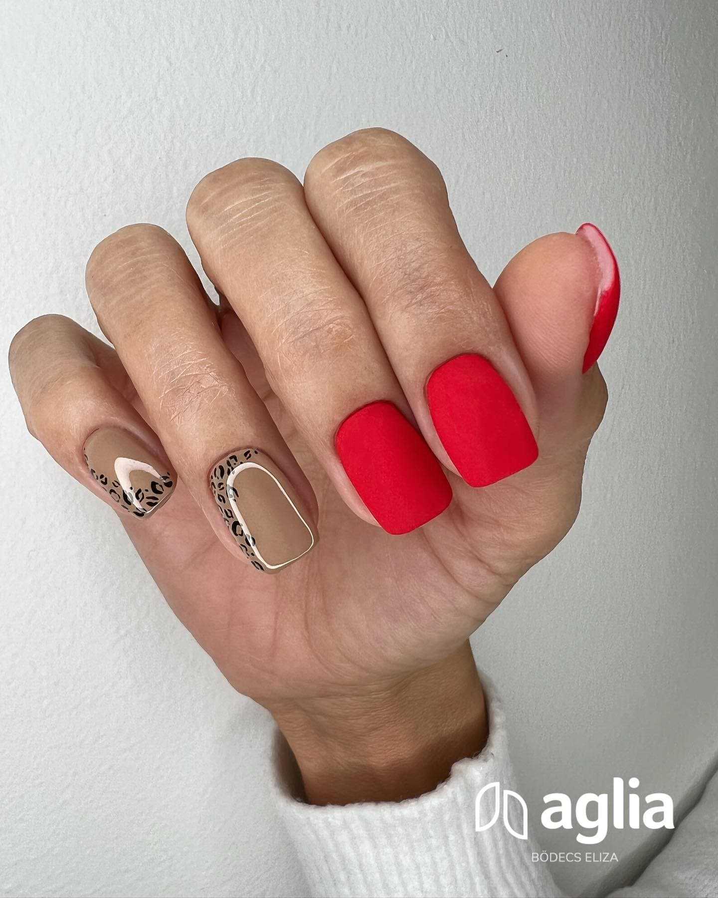 - Тандем нового матового дизайна появился в 2021 году. Например, рука с базовым красным покрывается гель-лаком, а «разноцветная» рука украшается матовым покрытием. Еще один вариант нового дизайна – это, когда ноготки красного маникюра остаются без дополнительного дизайнерского оформления, а на разноцветный маникюр второй руки наносится дизайн.