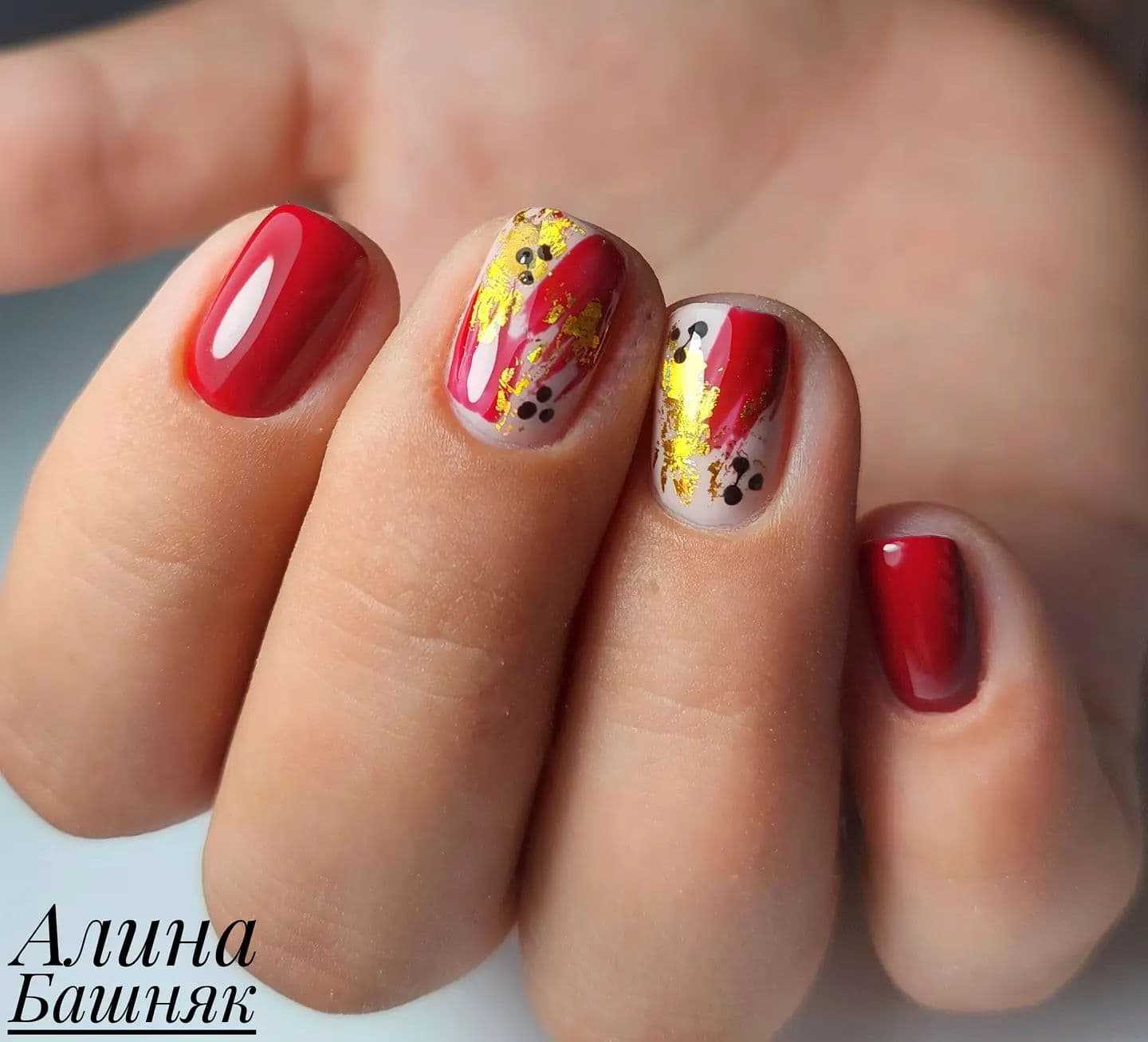 Золотистый с красным – это страстный, яркий и притягивающий внимание маникюр. Золото благородно и богато оттенками: золотая фольга придает торжественный вид, узоры золота, красный френч украшенный орнаментом – это немногие варианты комбинирования