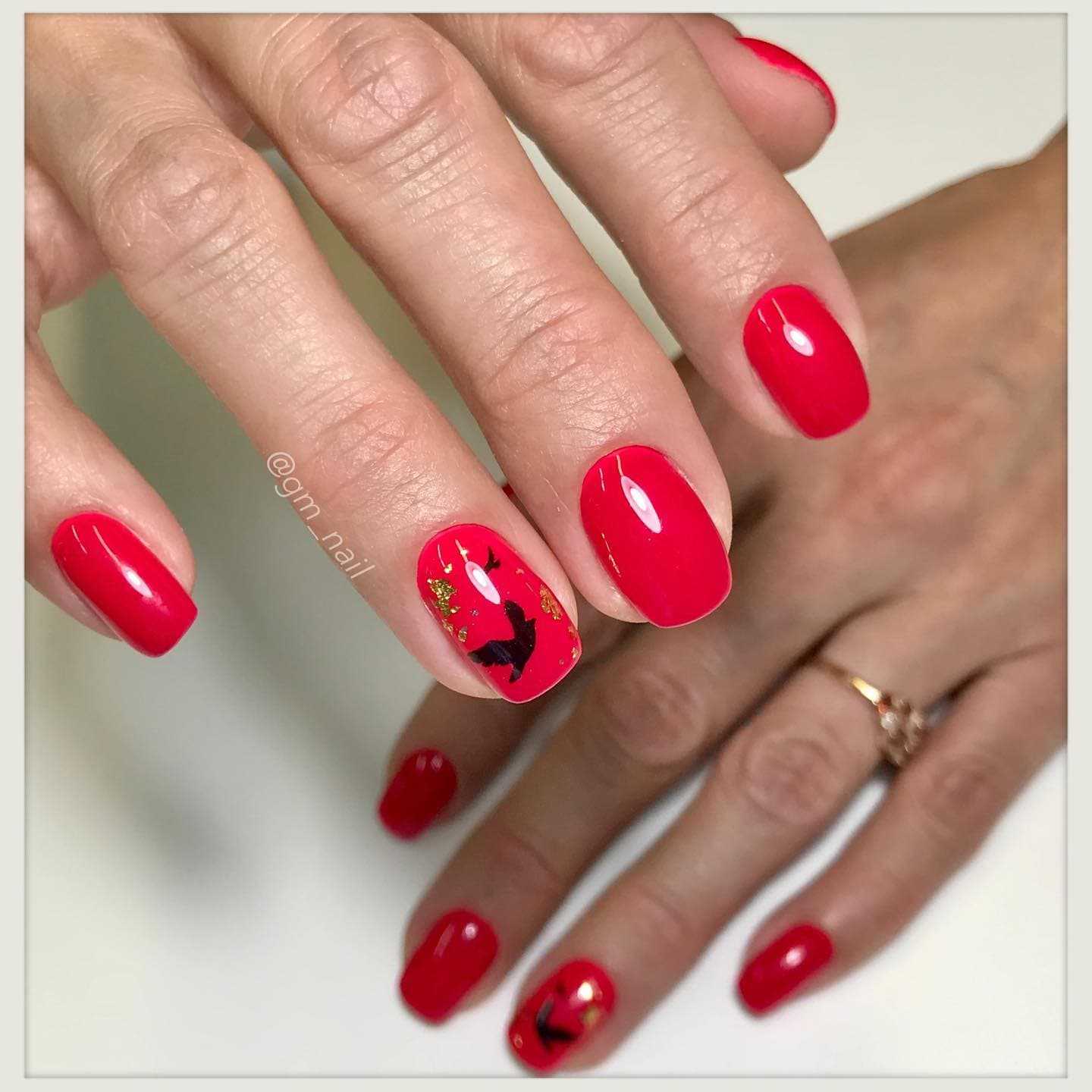 Если ноготки очень короткие, лучше выбирать яркие красные оттенки с оранжевым подтоном, они визуально вытягивают ногтевую пластину. Если дизайн ногтей красный с черным, второй оттенок нужно использовать по минимуму, например, для прорисовки узоров или контуров. Покрытие коротеньких ноготков черным гель-лаком сделает их еще миниатюрнее.