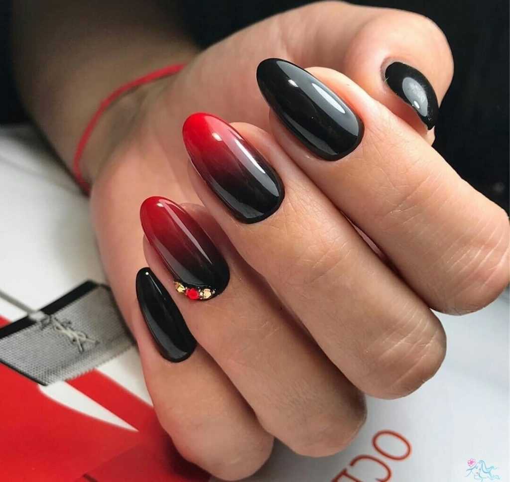 Для яркого контрастного градиента уже потребуется большая длина ногтей. Черно-красный омбре считается одним из наиболее эффектных среди градиентов.