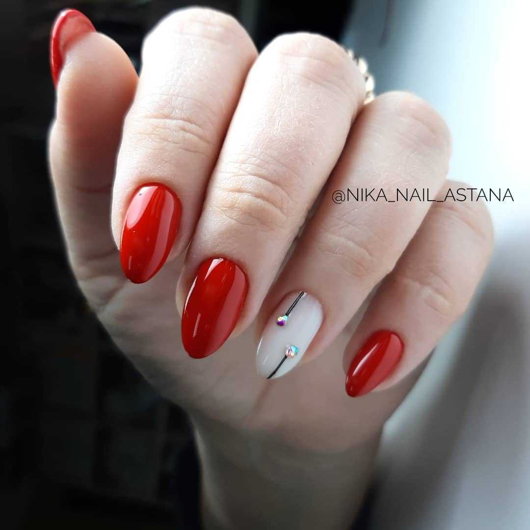 Если вы опасаетесь, что насыщенный красный цвет на миндалевидных ногтях будет излишне вызывающим, то можно выбрать матовое, а не блестящее покрытие. В этом случае образ будет сдержанным, аристократичным.