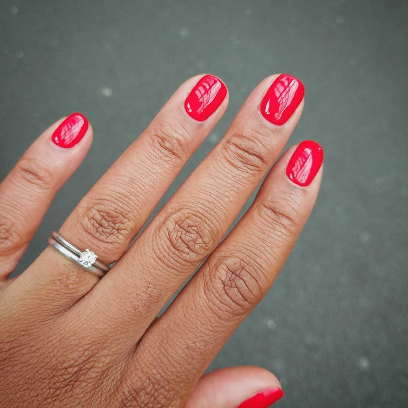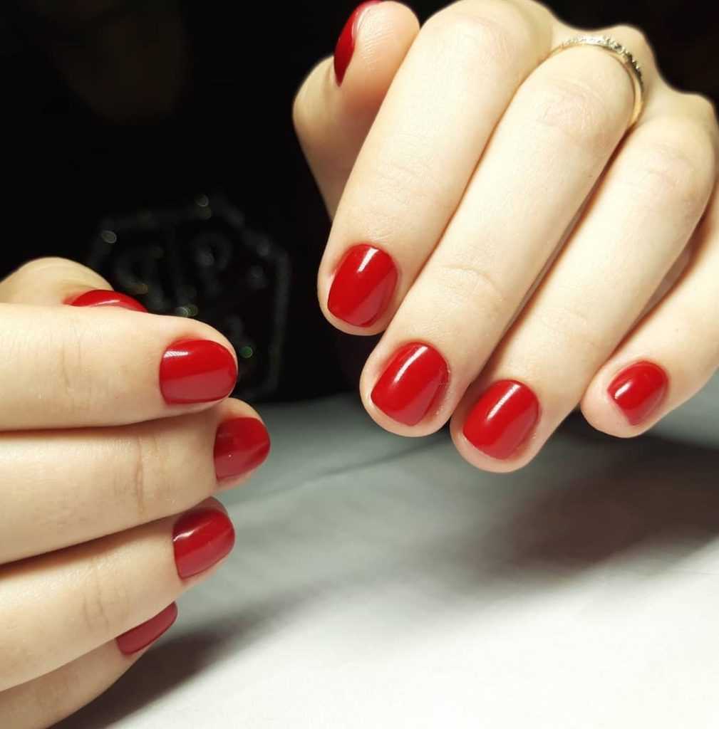 Красный маникюр на коротких ногтях под глянцевым топом.