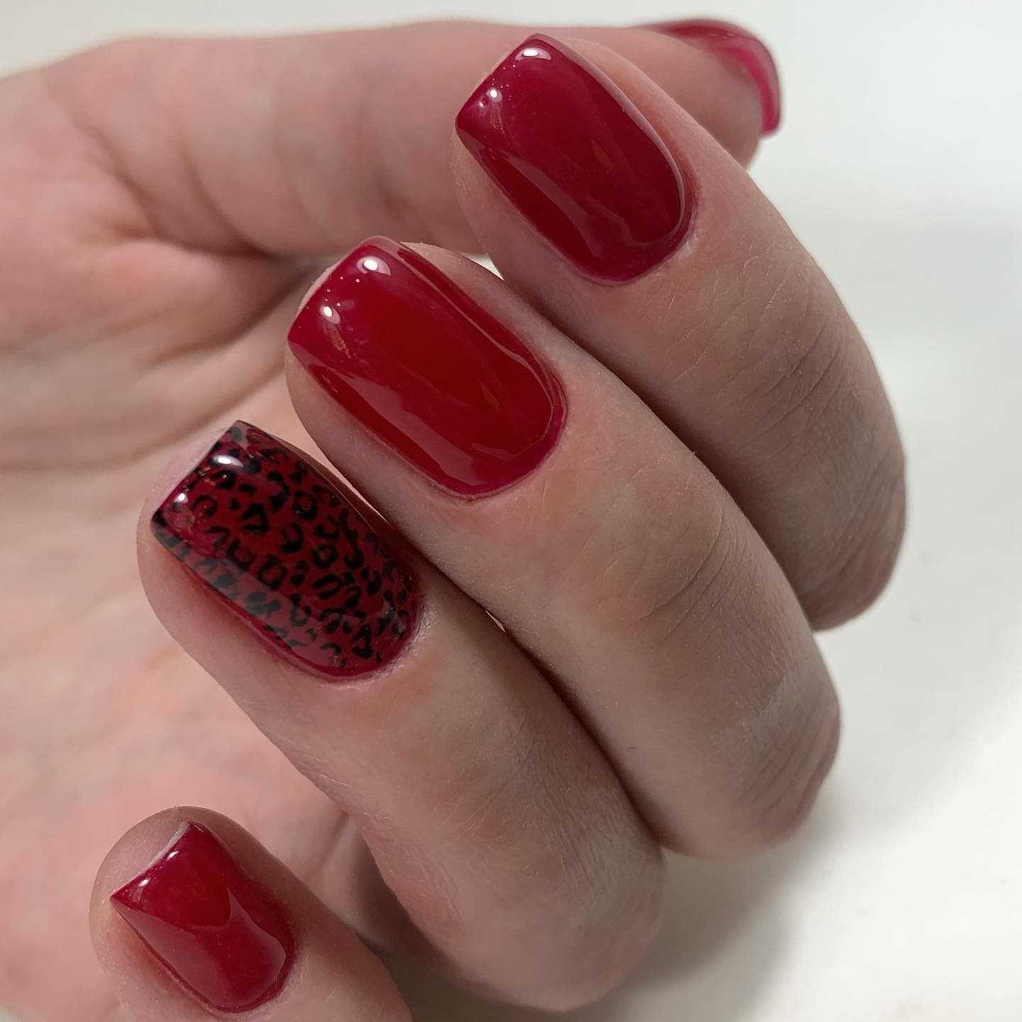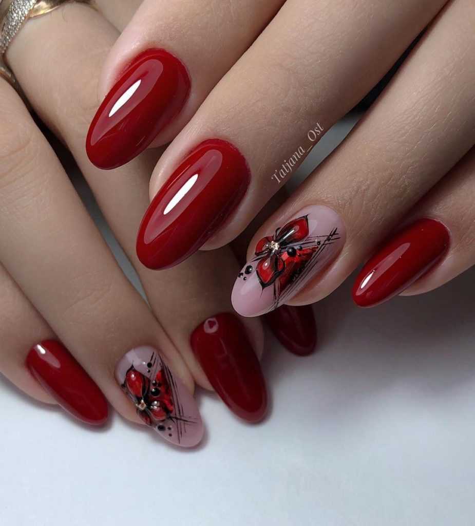 Если появилось желание задекорировать красные ноготки, то начать эксперименты можно с текстур и рисунков в рамках одного и того же цвета.