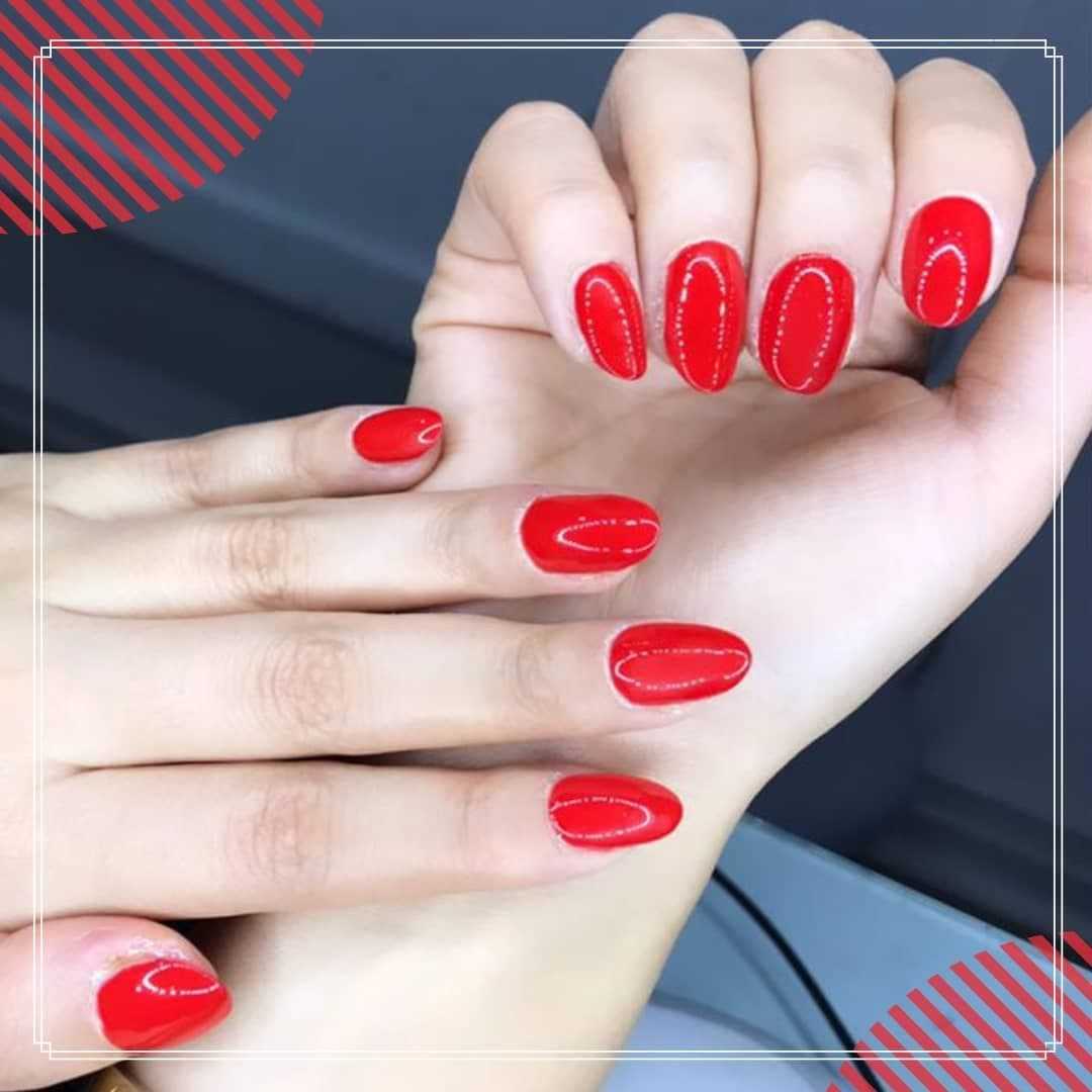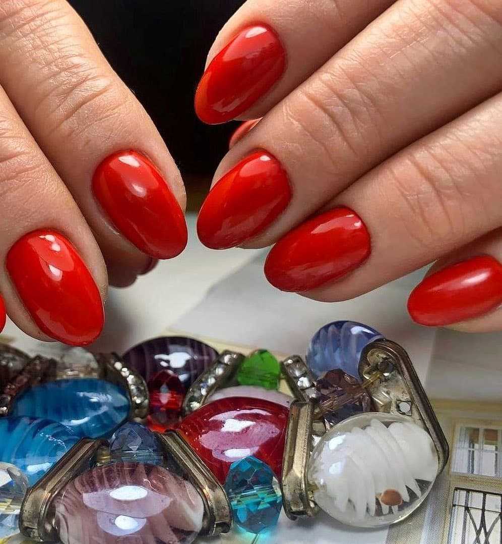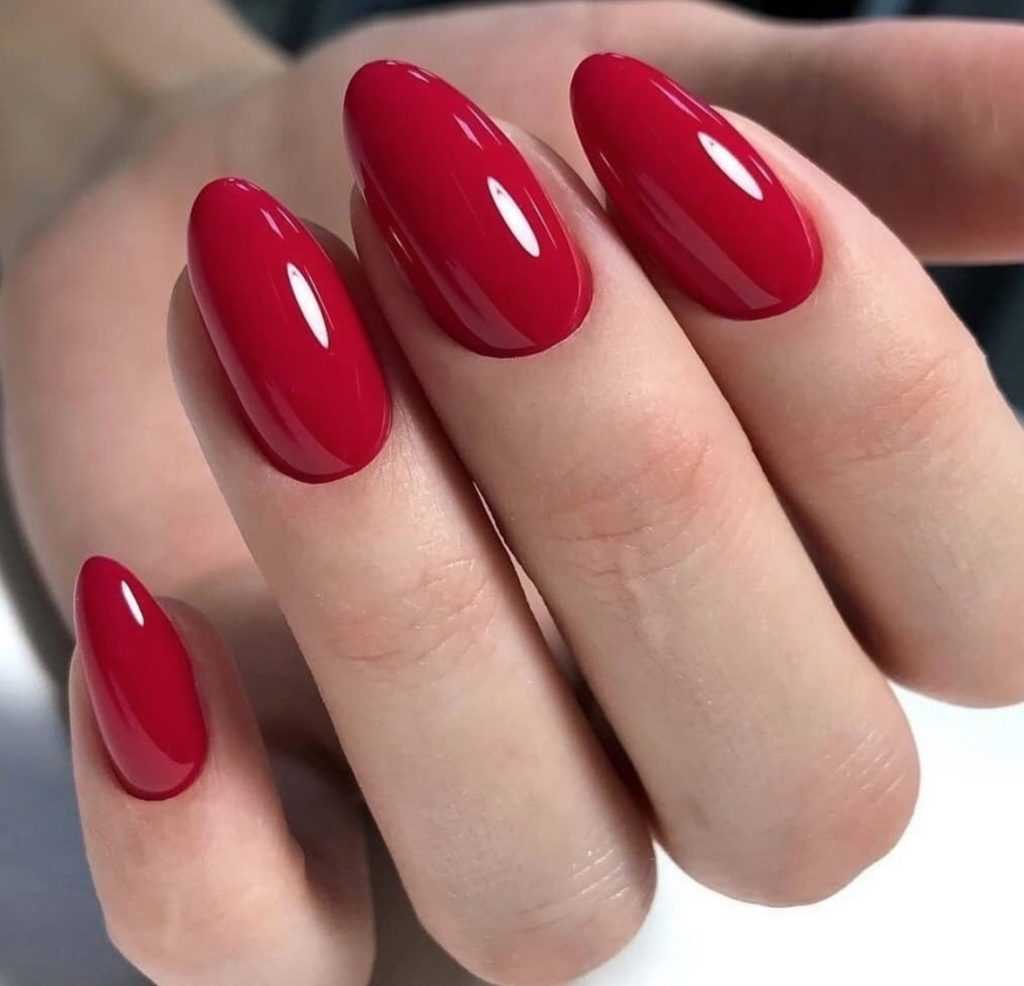 Красный маникюр на миндалевидных ногтях