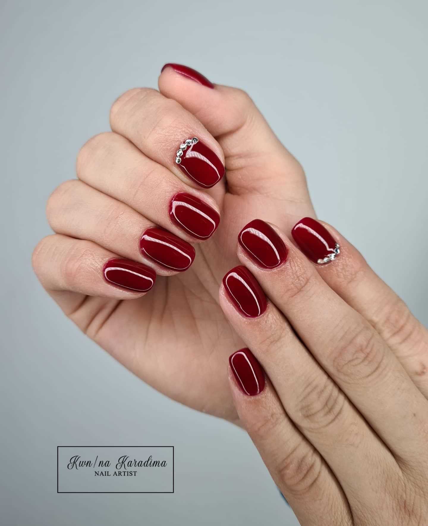 Красно-вишневый – очень яркий и выразительный, поэтому комбинировать его с другими цветами нет необходимости, возможно только использование декоративных элементов. Такой маникюр отличается только декоративными элементами и отлично подойдет к любому образу, подходит для любой формы ногтей.