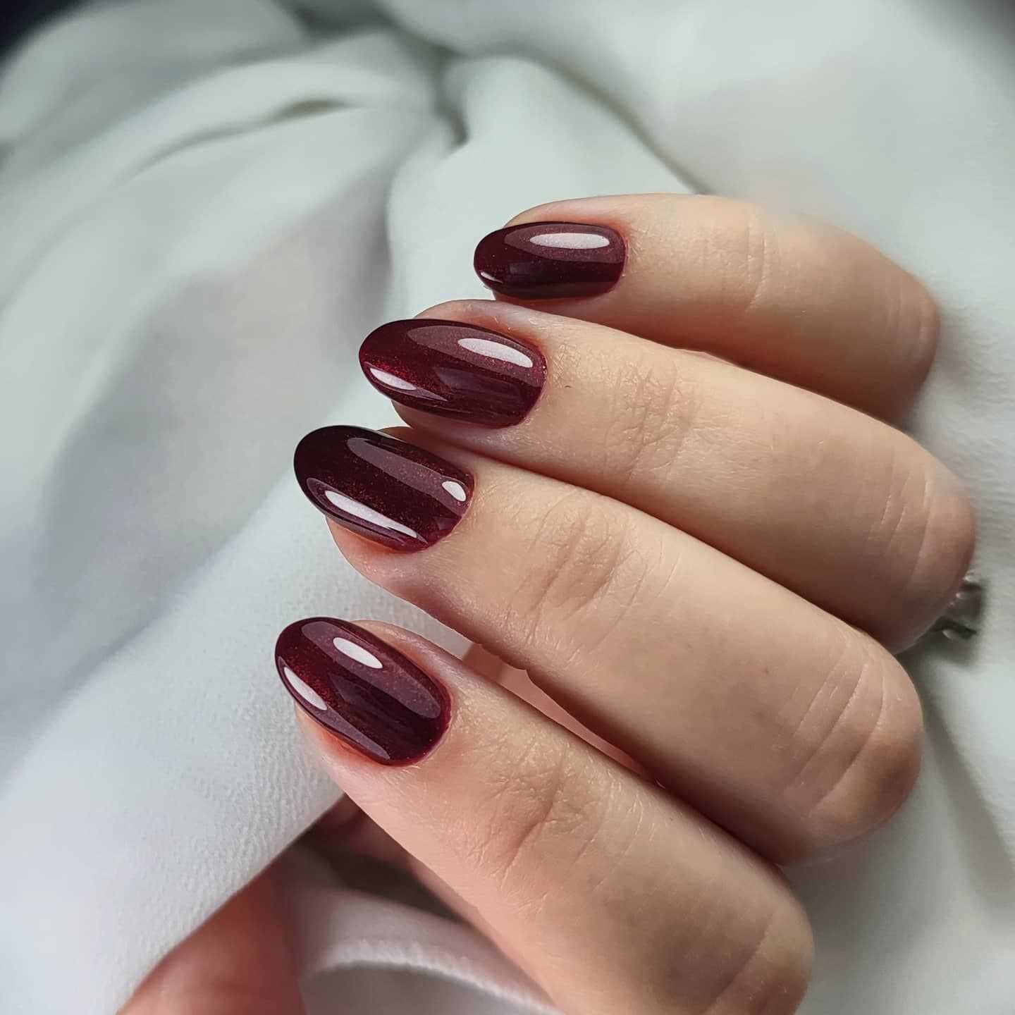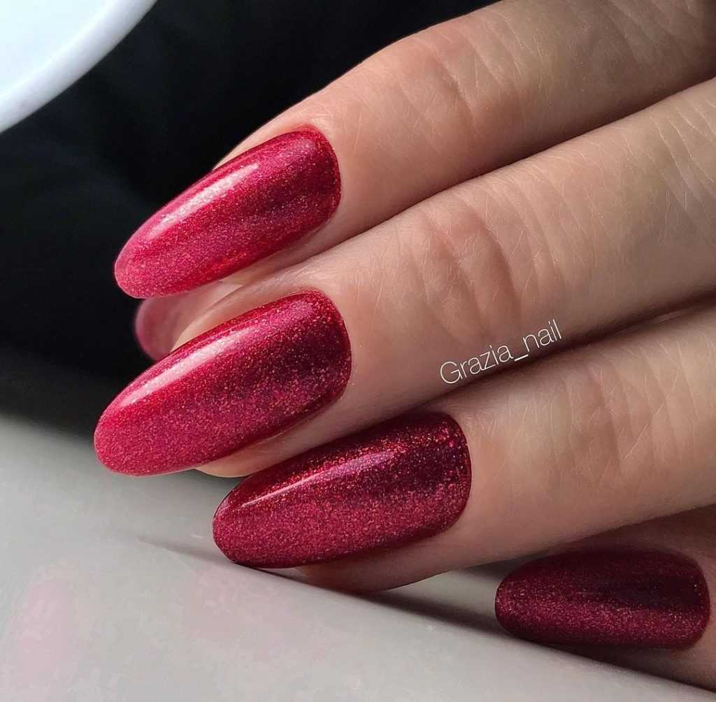Малиновый маникюр прекрасно сочетается с удлиненной овальной формой.