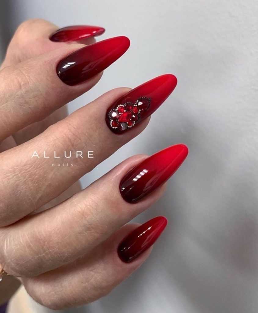 Еще один шикарный красный маникюр в технике омбре. Чтобы носить выглядящие по-королевски ногти нужно и чувствовать себя соответствующе.