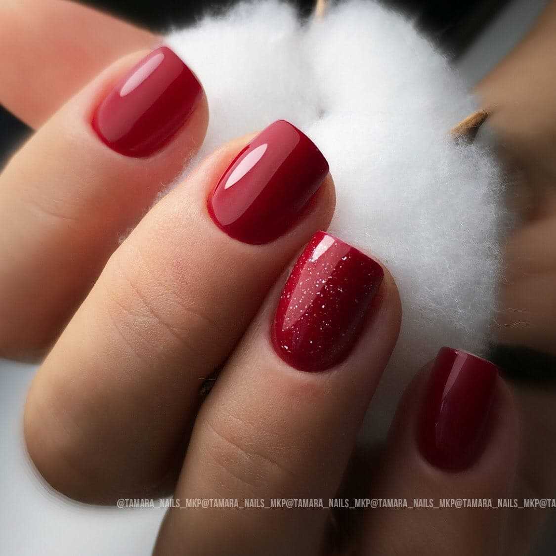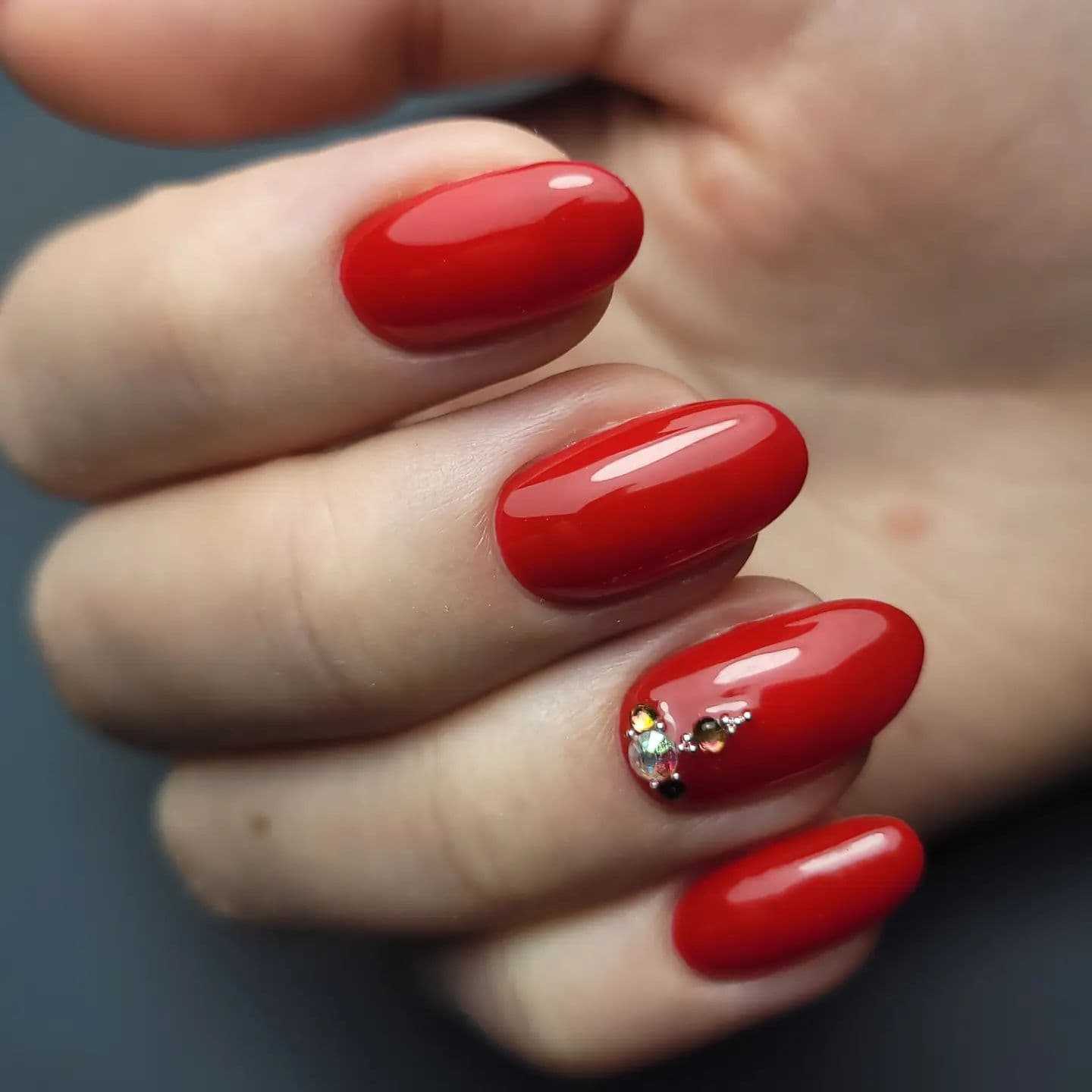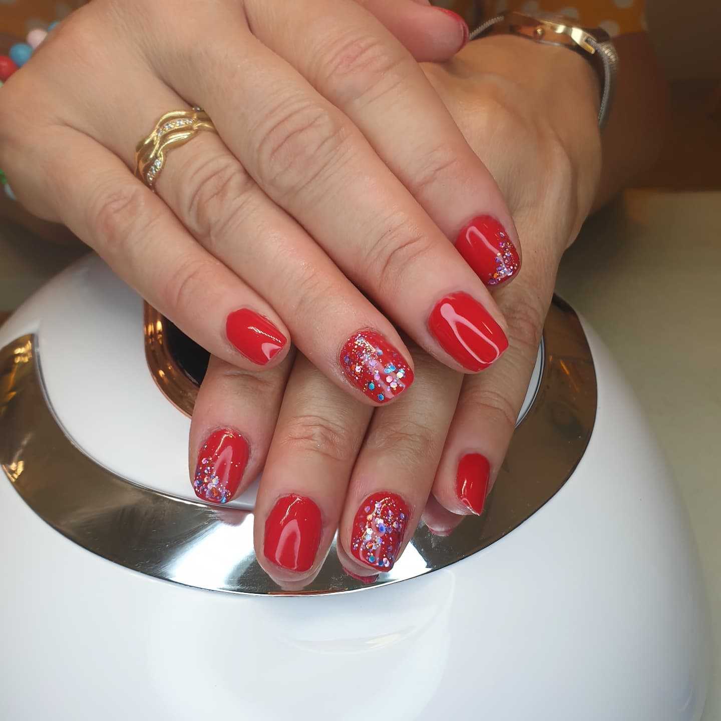 Если красный гель-лак содержит шиммер, то это исключает любой дополнительный декор.