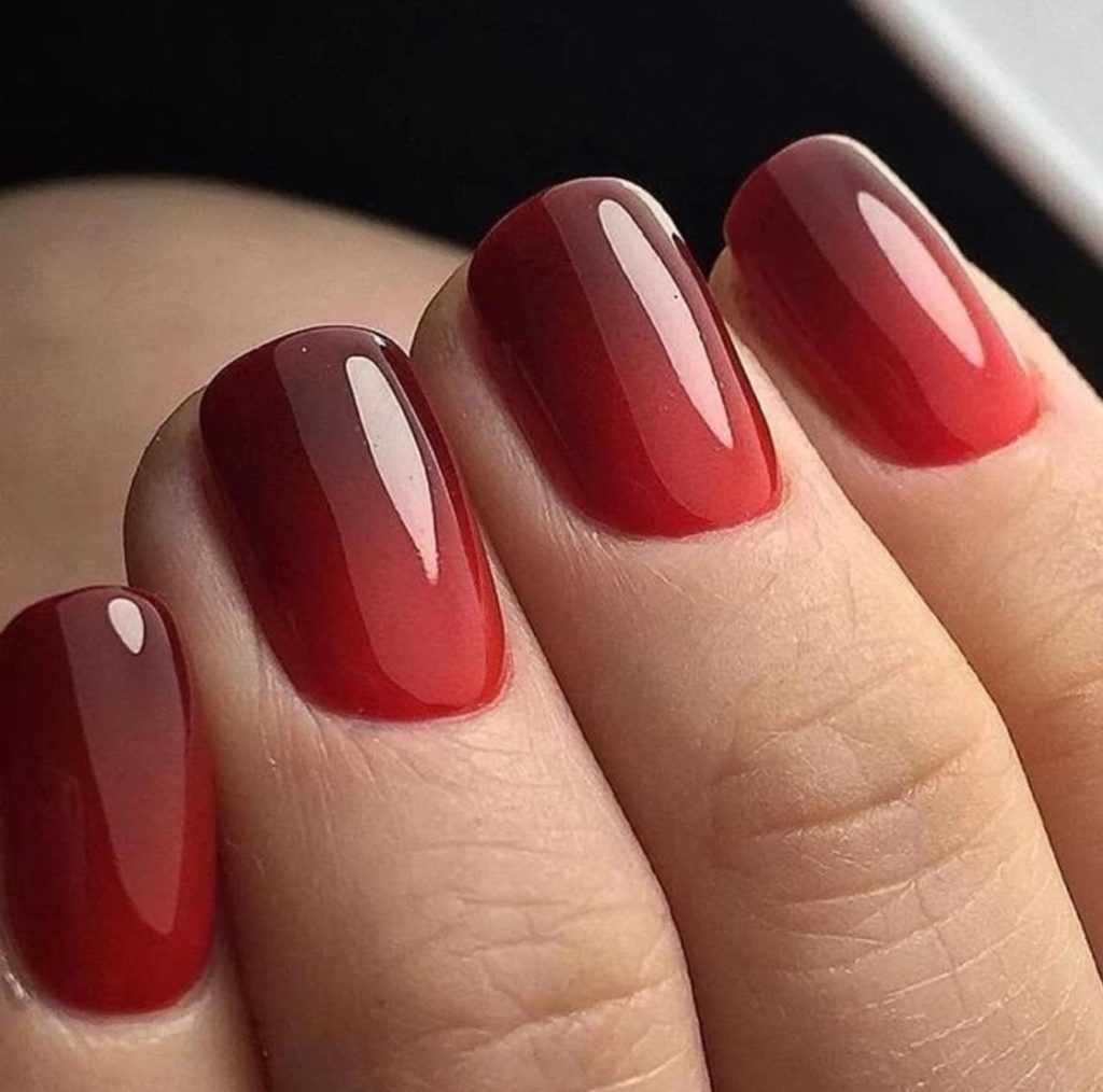 Красивый дизайн в технике омбре. Плавный переход из светло-красного в темно-красный можно сделать и на небольшой длине ногтей.
