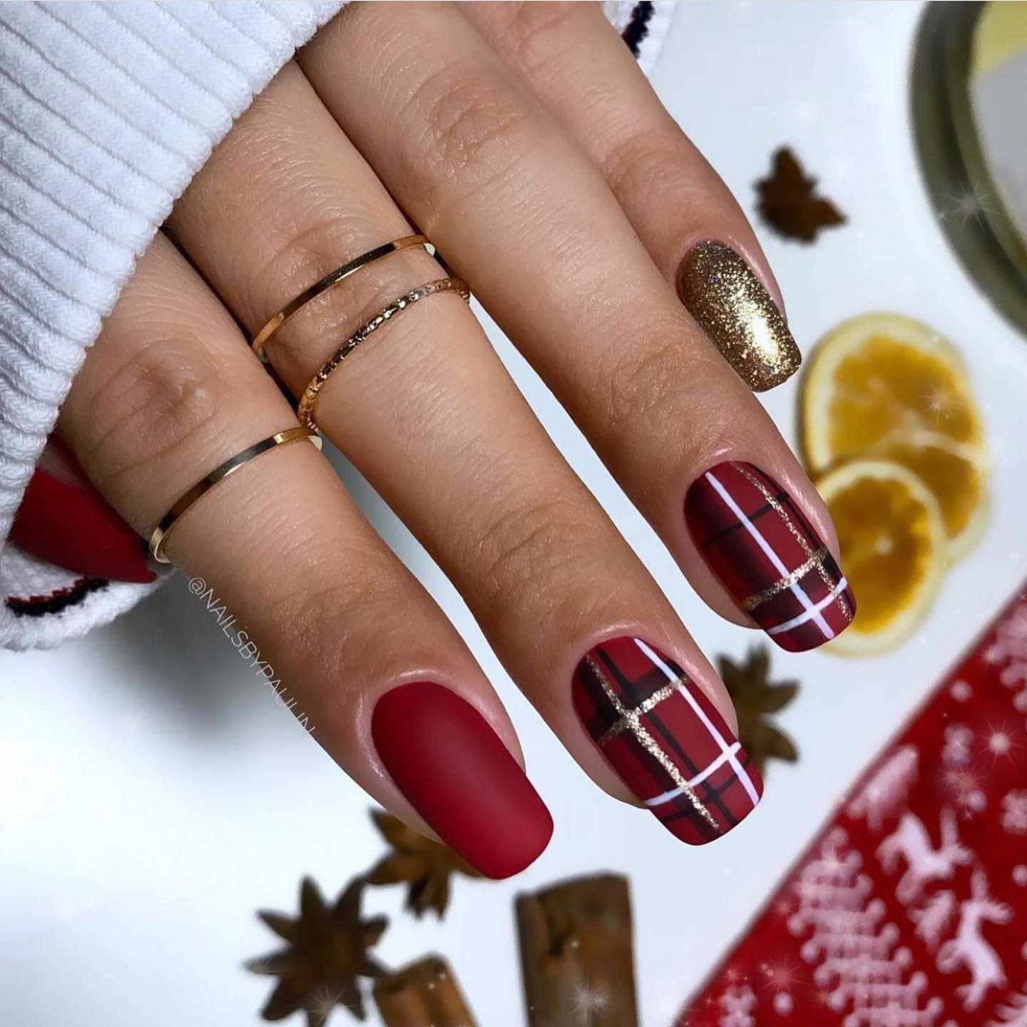 Геометрия — не самый легкий дизайн, но зато ваш новый маникюр не останется незамеченным. И вместо белого можно взять металлизированные блестки. Так что красный с золотом можно носить не только на Новый год.
