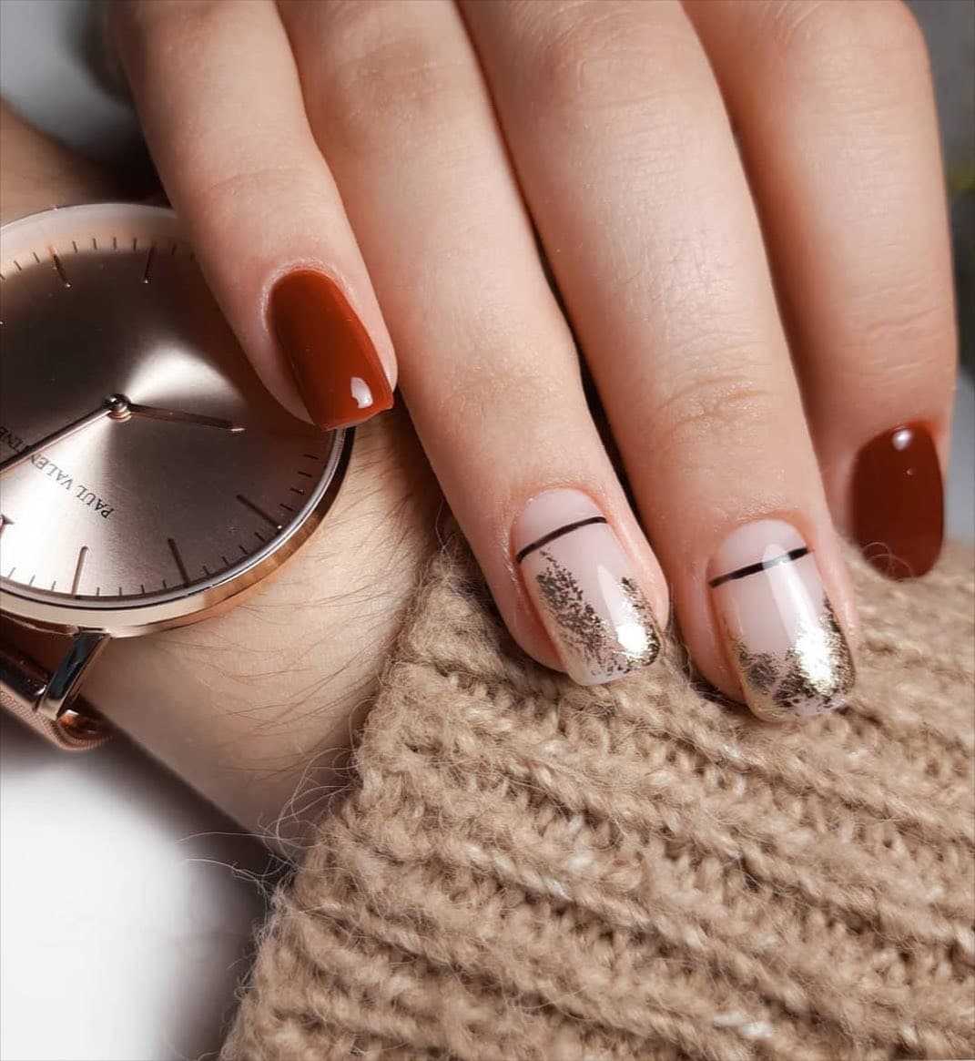 Индивидуальные вкусы и гармония в сочетании позволяет мастерам формировать интересные решения в выборе цветовой гаммы, к примеру, коричневый и красный. Строгий лаконичный маникюр. Благодаря сезонным предпочтениям, всегда находит своих поклонниц.
