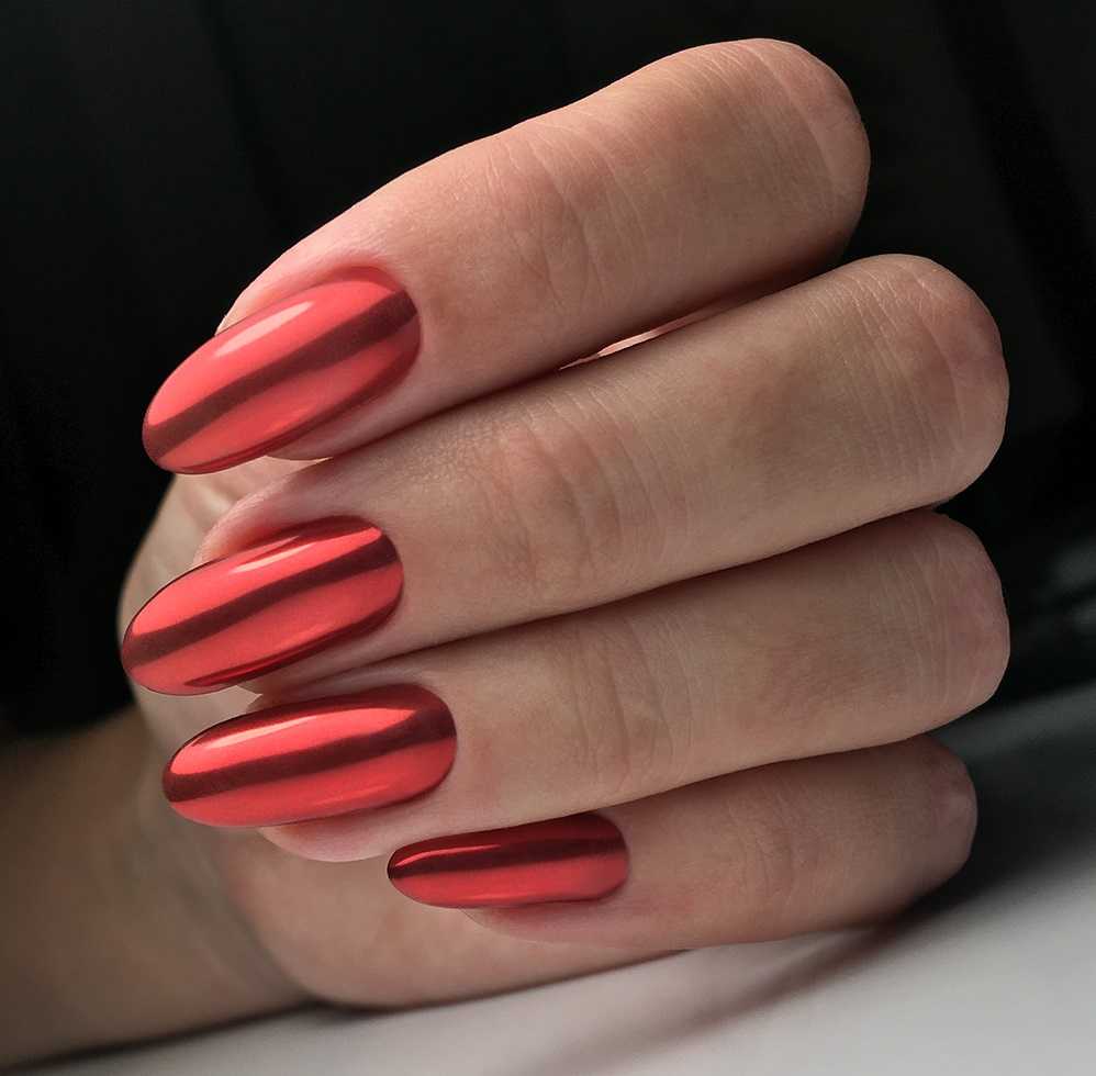 Совет! Красный металлик в маникюре — отличный вариант для коротких ногтей. Например, оттенок 105 каучукового гель-лака Emperor’s wife сгладит все неровности, а блестки в составе визуально сделают ногти длиннее.
