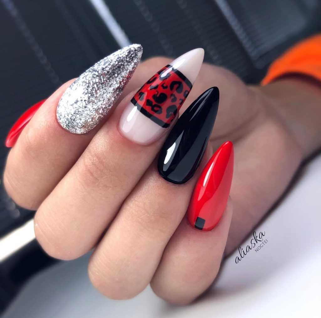 Еще более эффектно за счет контраста выглядит черно-красный маникюр на длинные ногти. Сочетать можно не только гель-лаки красного и черного цвета, но и декор в этих тонах. Красные ноготки будут еще выразительнее с черным рисунком или стразами. Обладательницам длинных ногтей не стоит бояться черного декора, имеющего способность «съедать» длину. На фото ниже дизайн в смелых красно-черных сочетаниях.