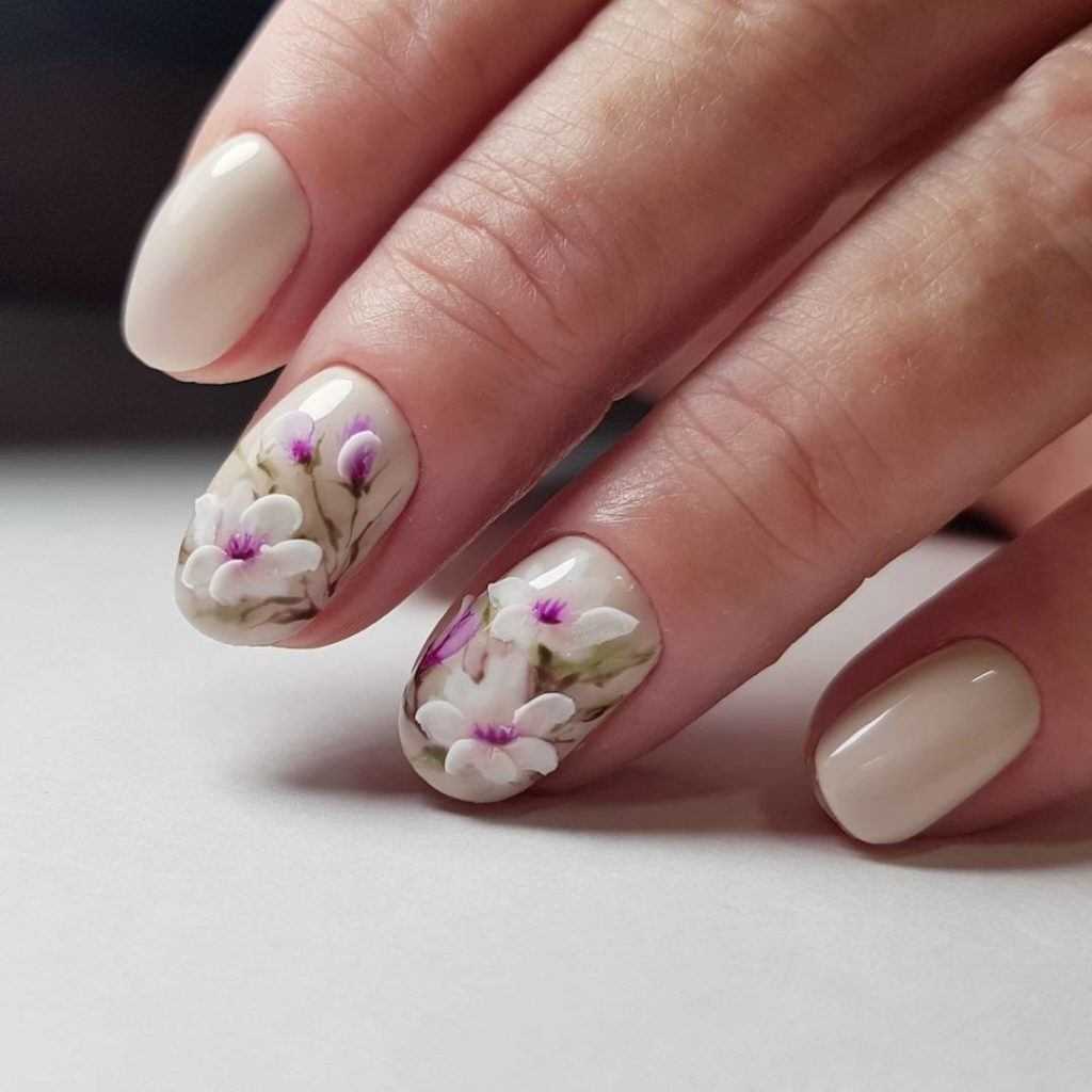 Желательно оформлять только 1-2 ноготка, акцентируя на них внимание. Если вы решили украшать все пальчики, выбирайте более нежные приземленные композиции, как на фото