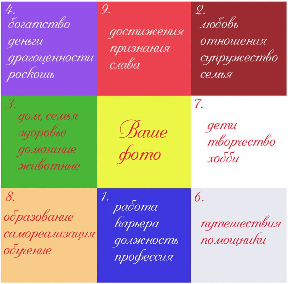 Вот так выглядит карта желаний по системе фэн шуй, где: