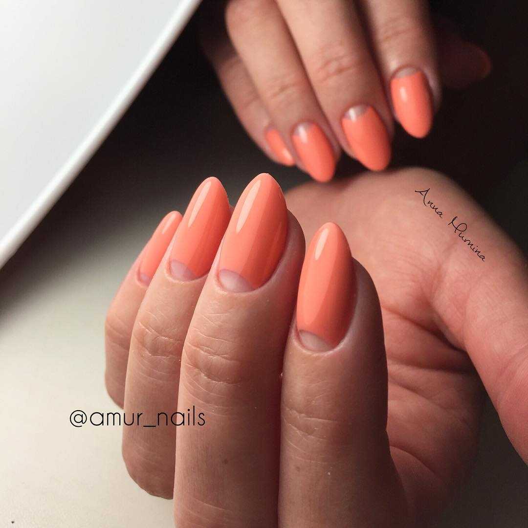 Не менее интересен вариант с коралловым фоном и белыми лунками. Его также не стоит украшать стразами или блестками – они будут лишними и сильно упростят идею. Такой маникюр будет неплохо смотреться с деловым костюмом соответствующего цвета и понравится женщинам, работающим в офисе или занимающим высокую должность. В 2022-2023 делается акцент на лаконичность, что проявляется в минимальном использовании декора.