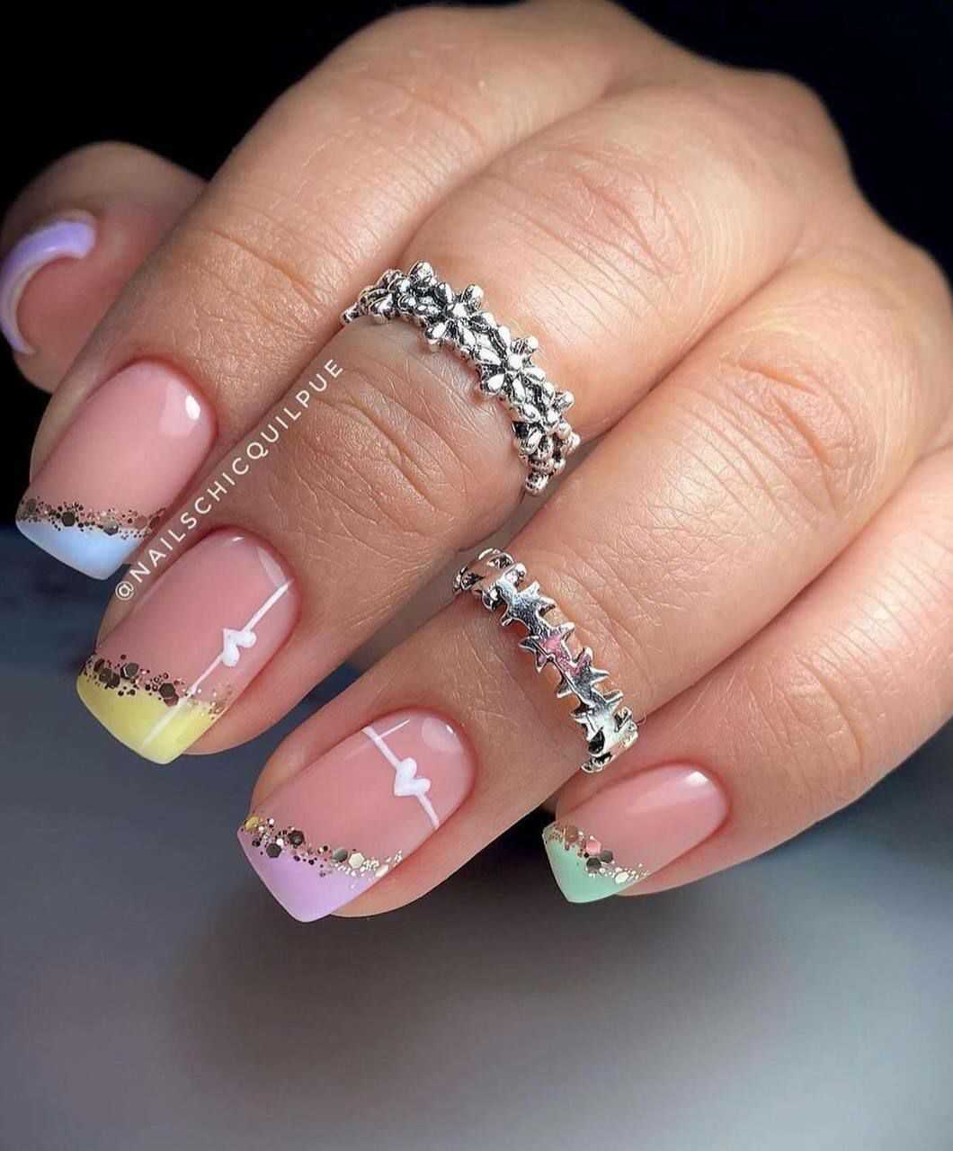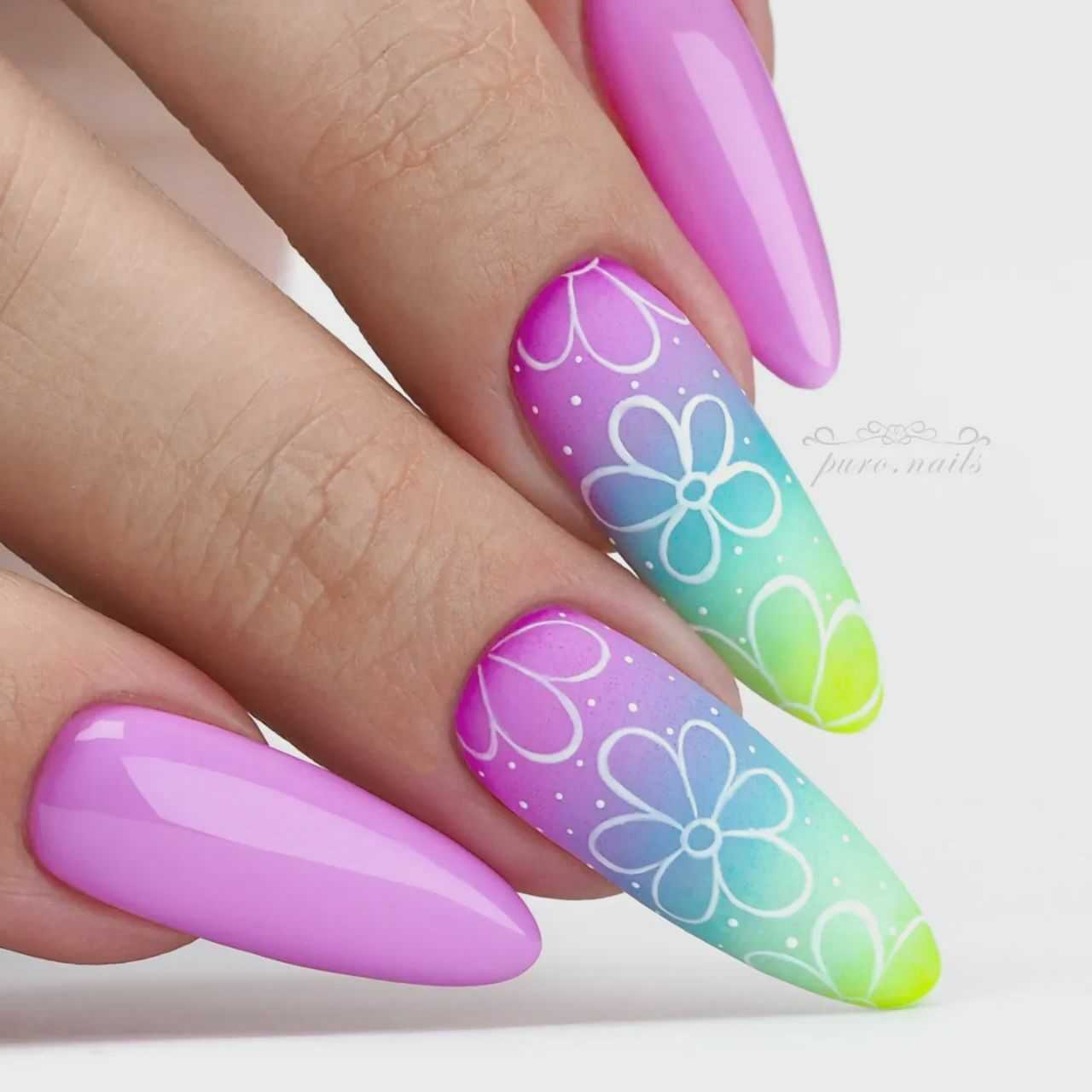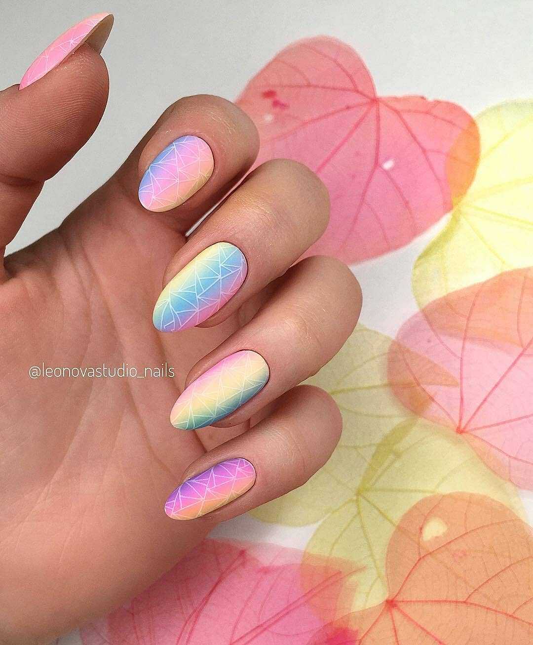 - Радужный. Это интересный нейл-арт, который на длинных ногтях делается из вертикальных полос.