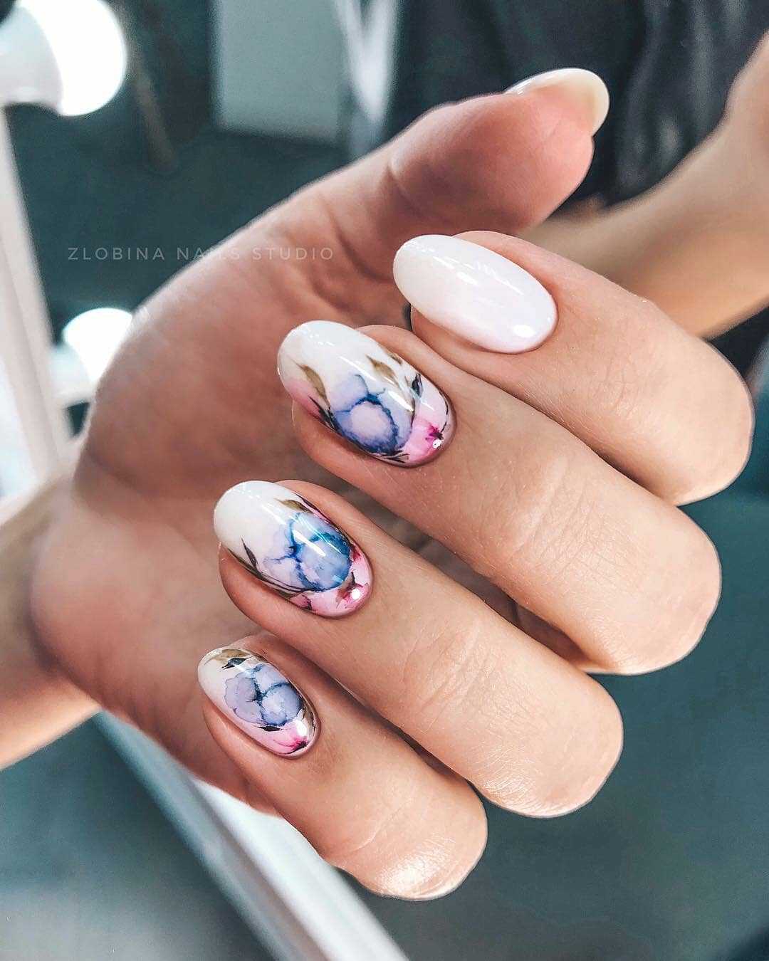 Мраморный принт можно выполнять на всех ноготках сразу, а можно выделить им лишь пару ноготков. Часто мастера вместе с мраморным принтом используют втирку. Втирка обычно имеет холодный цвет.