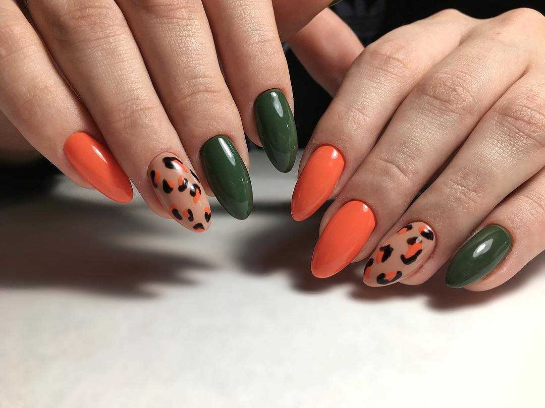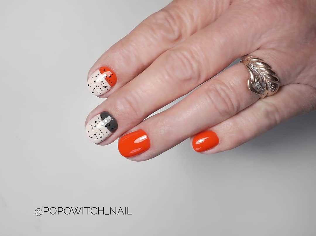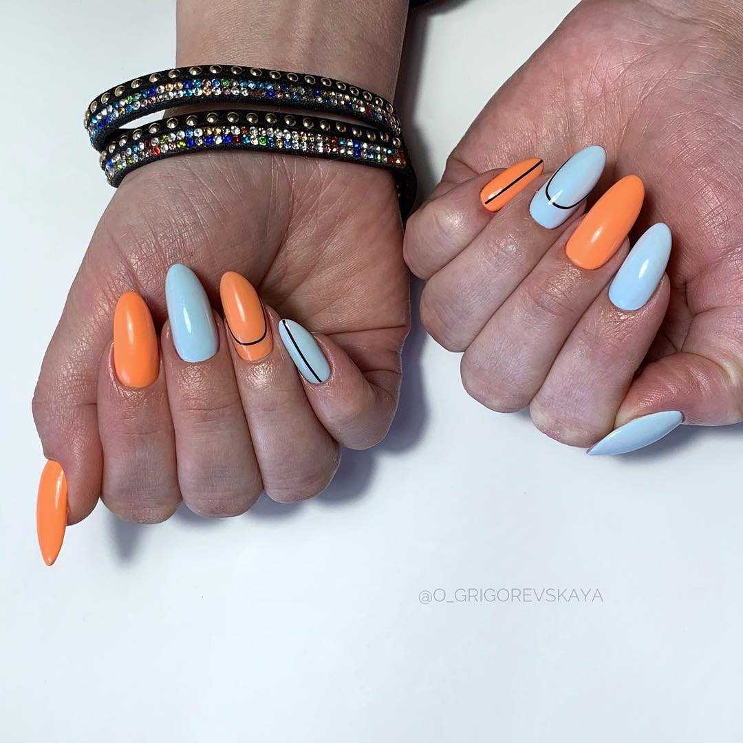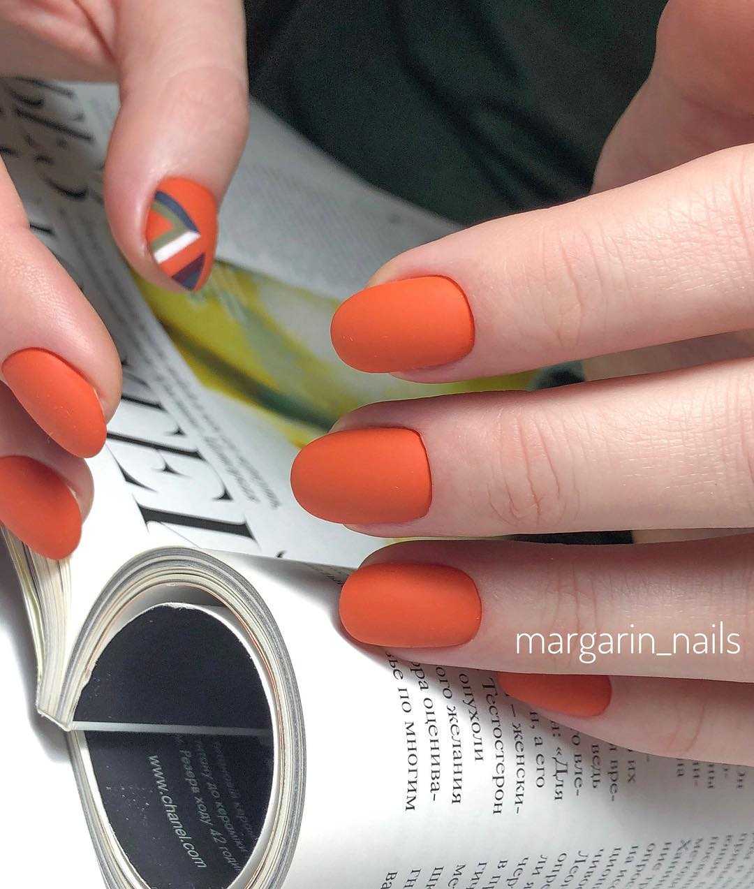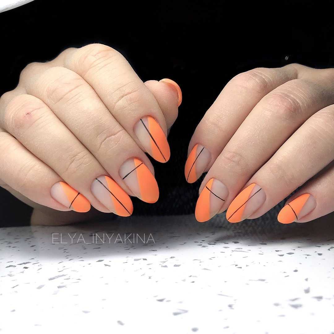 Трендовый оранжевый может быть не только приглушенных тонов. Яркие неоновые покрытия красиво смотрятся с надписями и нейл-рисунками черного цвета. Данное покрытие может быть сплошным или комбинированным с прозрачным лаком. Оранжевый допустимо сочетать с другими цветами, если это подразумевает дизайн.