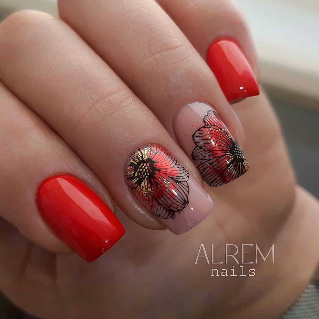 Элегантный цвет, который в сезонном маникюре можно оформить белыми и желтыми цветами. Они сделают насыщенный алый легким и непринужденным. А если комбинировать красный с черным и золотым, то дизайн получится более, чем эффектный.