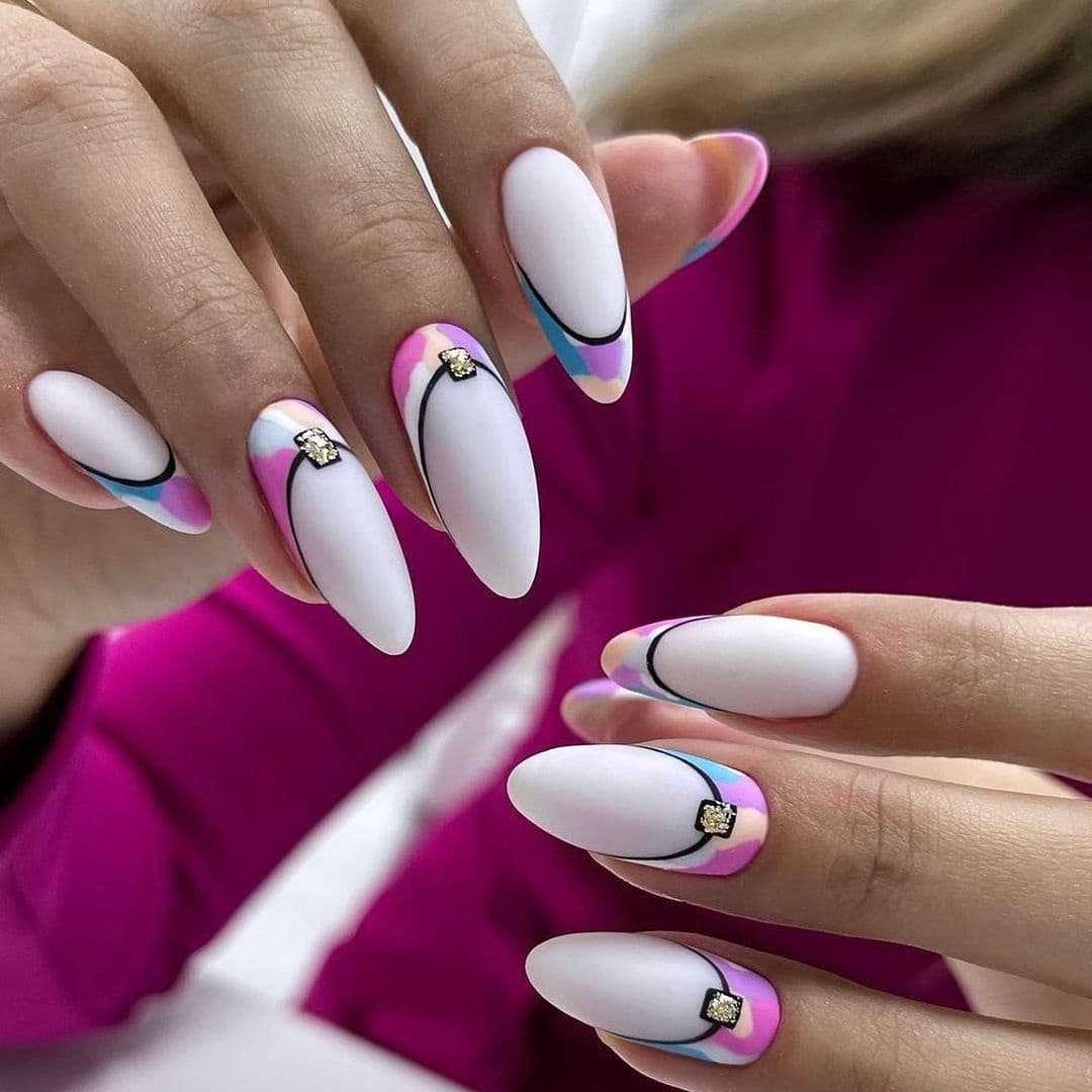 Эта форма маникюра визуально удлинят пальчики. На сегодняшний день самое актуальное в дизайне – это френч и омбре, но с дополнительными декоративными украшениями. При нанесении однотонного лака, лучше добавить пару ярких акцентов.