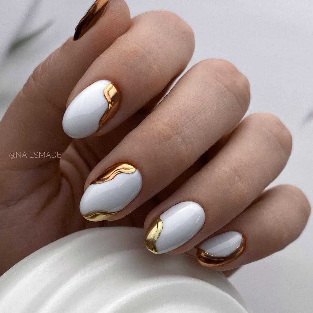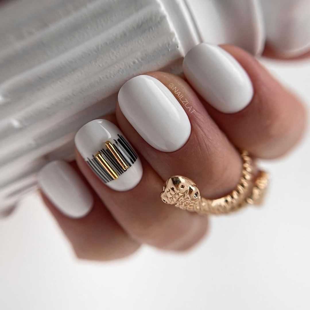 Этот цвет придает маникюру праздности и торжественности. Он отлично контрастирует со всеми цветами. Подойдет, как основа под мрамор, цветную мозаику из блесток, для «улыбок» френча и лунного маникюра.