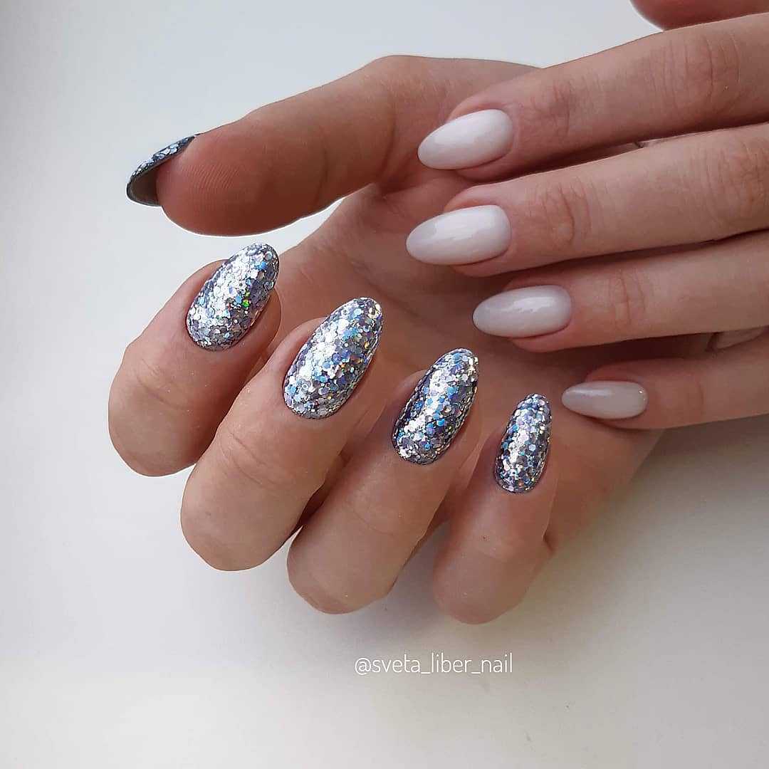 Даже если вы подберете классическую, однотонную покраску ногтей, то именно глиттер оживит его и сделает праздничным.